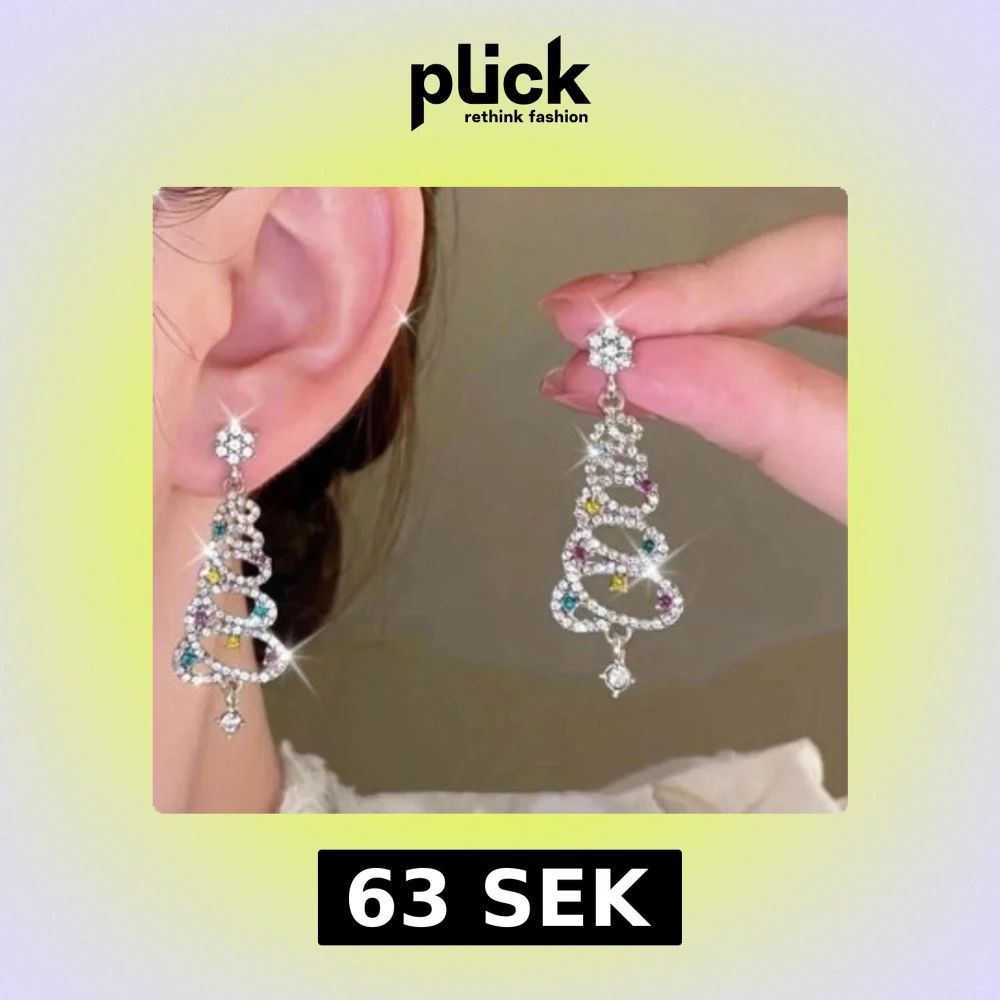 Superfina örhängen i form av julgranar, täckta av glittriga stenar i silver med inslag av grönt, rött och gult. Örhängena har en stjärna upptill och en hängande sten längst ner, perfekta för att sticka ut under julen.