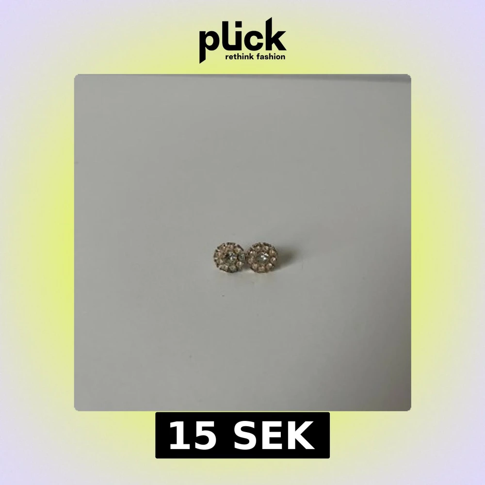 Säljer ett par små, runda örhängen med glittrande stenar i blomform. Örhängena har en guldig bas och är dekorerade med flera klara stenar.