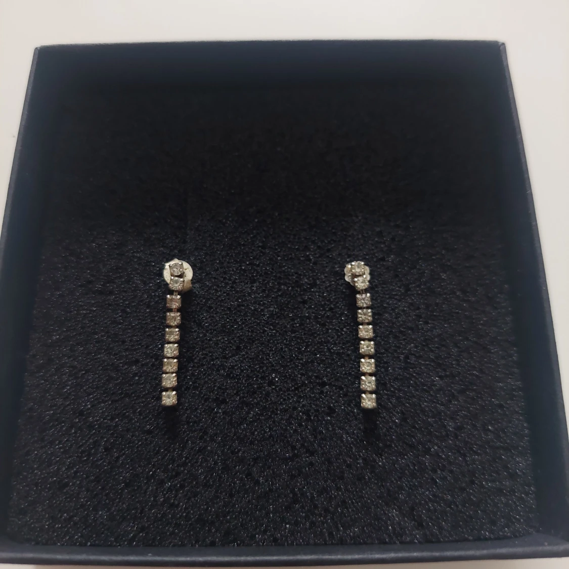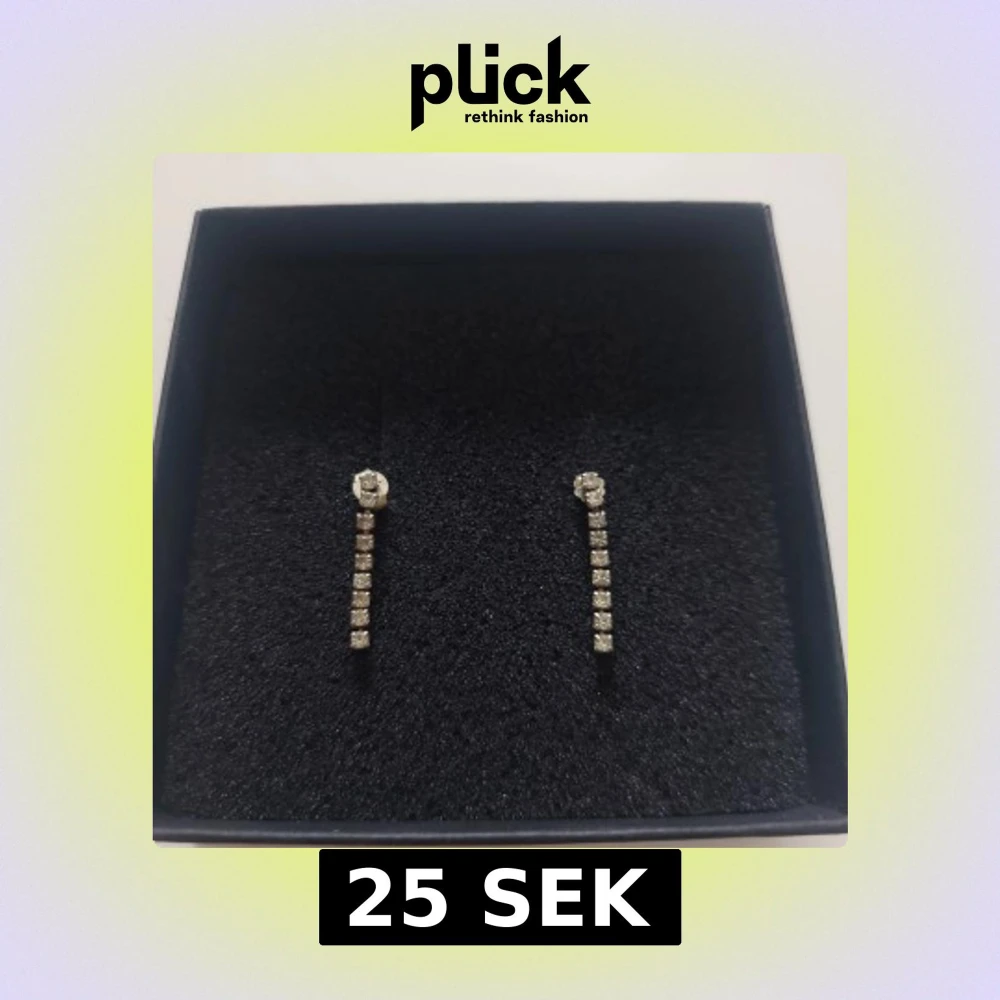 Snygga och eleganta örhängen i silver med glittrande stenar. De har en stilren design med en rad av gnistrande stenar som hänger nedåt.
