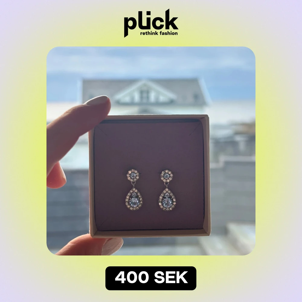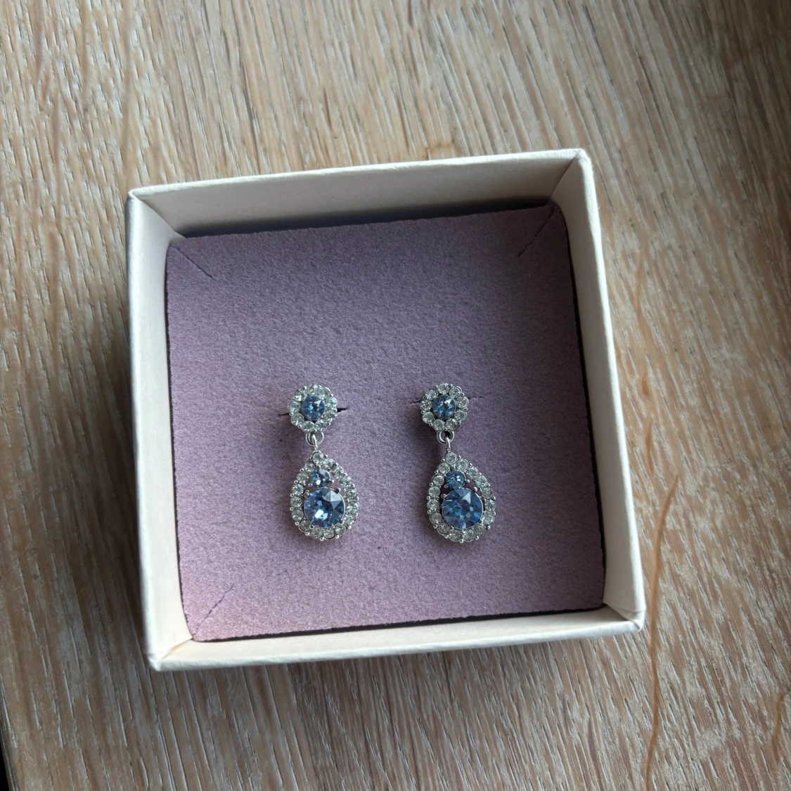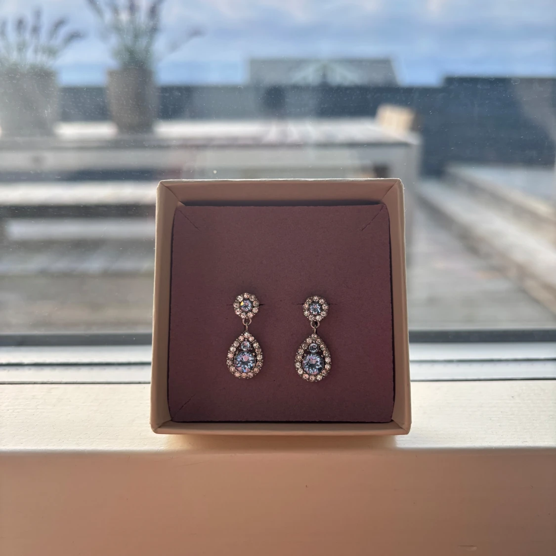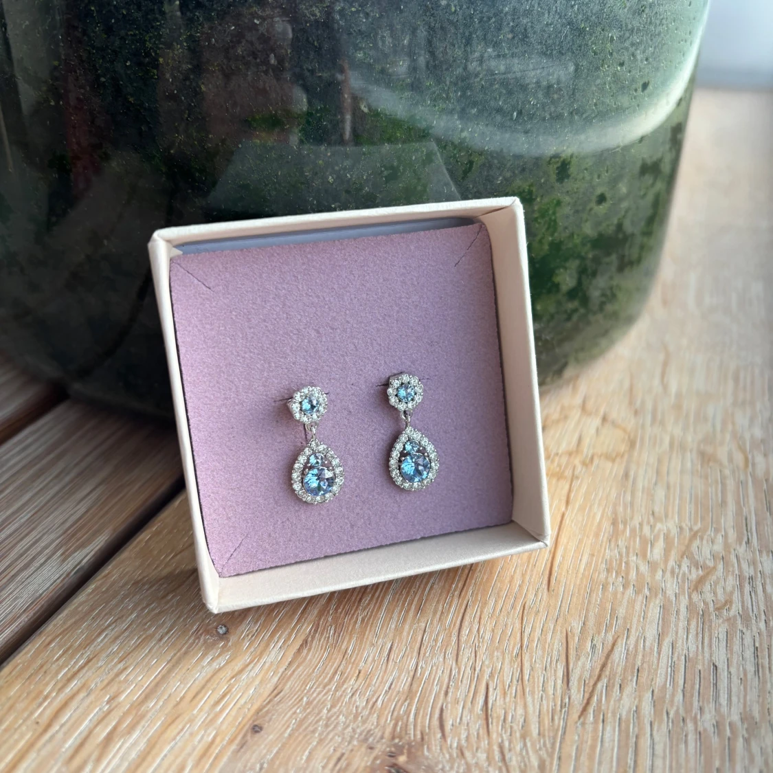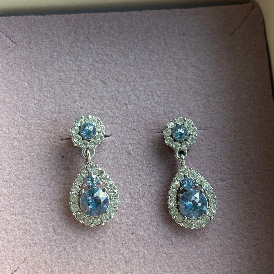 Eleganta örhängen med droppformade blå stenar omgivna av gnistrande kristaller.