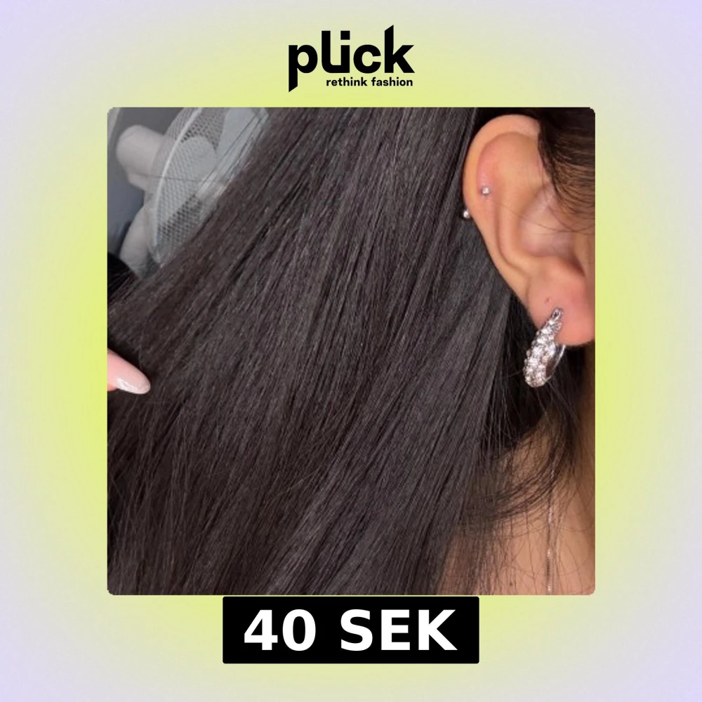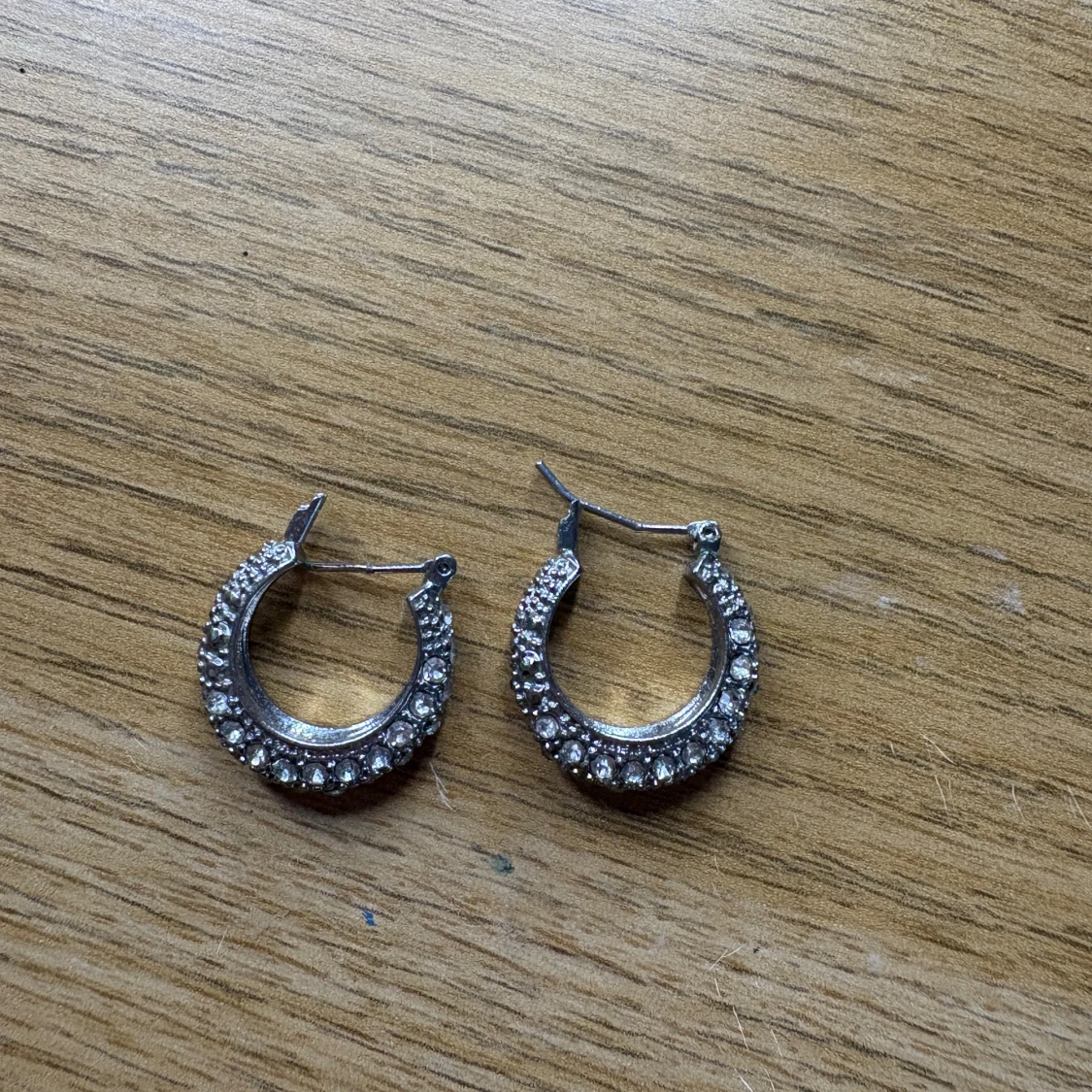 Säljer ett par snygga örhängen i form av creoler med glittriga stenar. De är silverfärgade och passar perfekt för att ge din look lite extra bling. Enkla att stänga med klicklås.