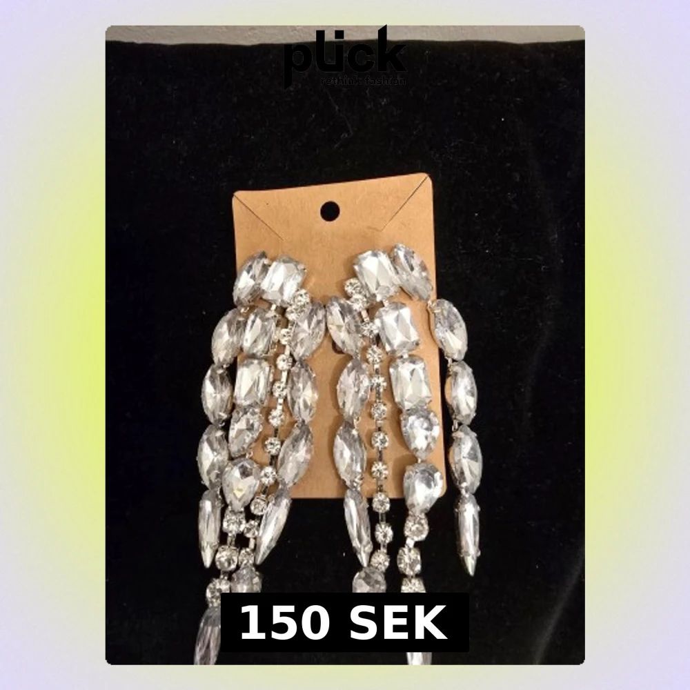 Säljer ett par statement örhängen med stora, glittriga stenar i silverfärg. Örhängena har flera rader av facetterade kristaller som ger en lyxig och iögonfallande look. Perfekta för att lyfta din outfit till nästa nivå.