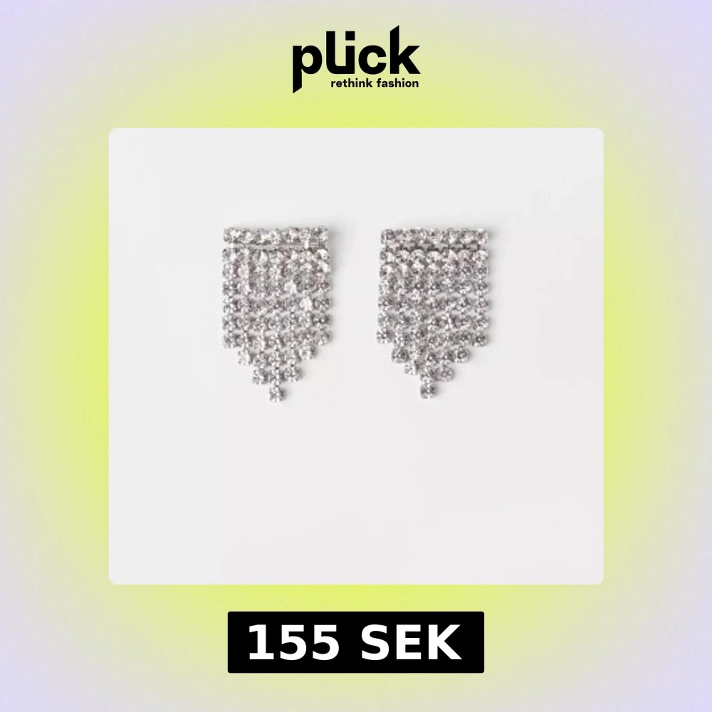 Säljer ett par snygga örhängen i silverfärg med glittrande strassstenar. De har en bred, rektangulär form som smalnar av mot spetsen och ger ett statement-look. Perfekta för dig som vill sticka ut med extra bling och cool stil.