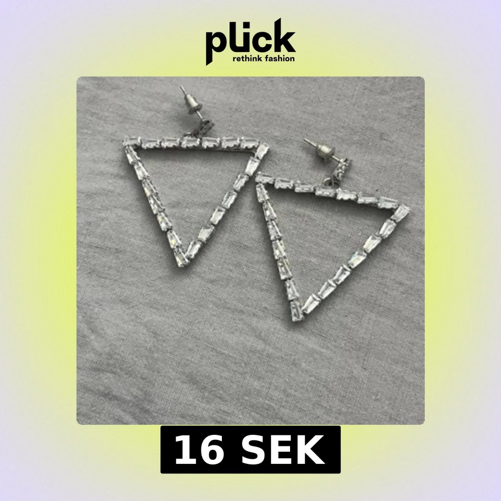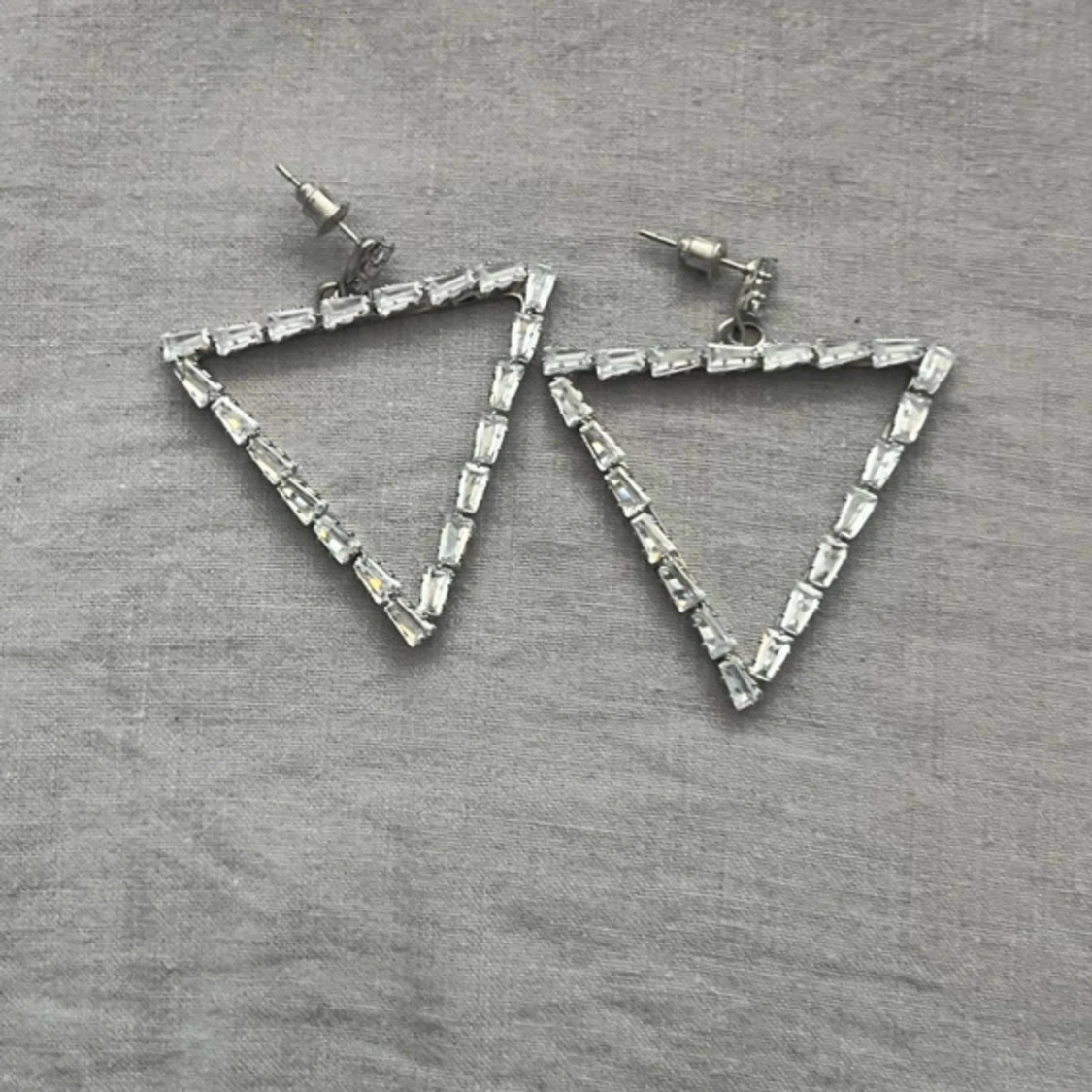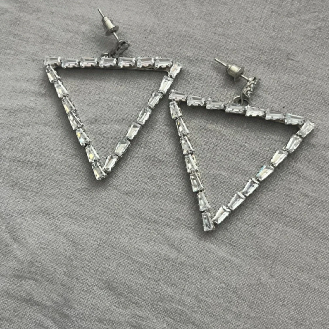 Säljer ett par stora, triangelformade örhängen med glittriga, rektangulära stenar i silverfärg. De har en modern och edgy vibe, perfekta för att sticka ut. Stiftfäste i metall och cool geometrisk design som drar blickarna till sig.