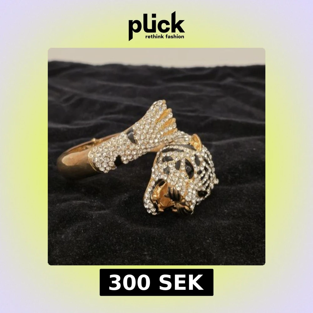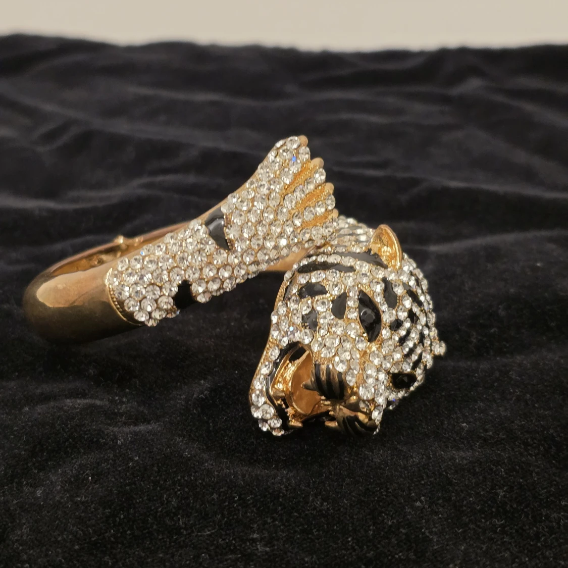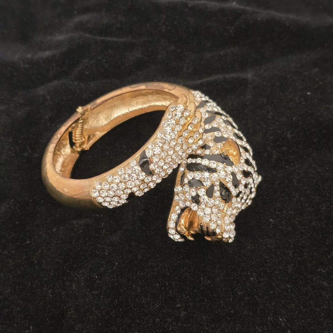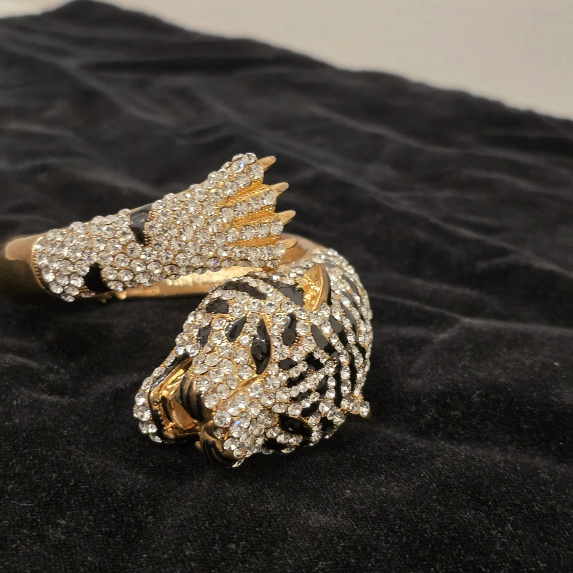 Unikt armband i guldton med ett detaljerat tigerhuvud och tass, täckt av gnistrande stenar. Svarta detaljer skapar ett coolt mönster som påminner om en leopard eller tiger. Perfekt statement piece för dig som vill sticka ut.