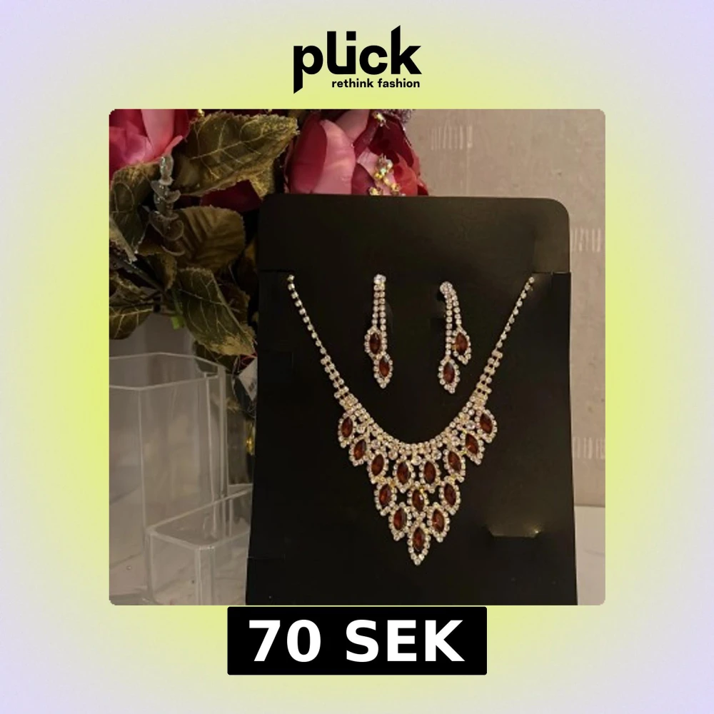 Snyggt smyckeset med halsband och matchande örhängen i guldton med glittrande stenar och bruna, droppformade kristaller. Perfekt för att sticka ut med extra bling och passar till fester, bröllop, bal…
