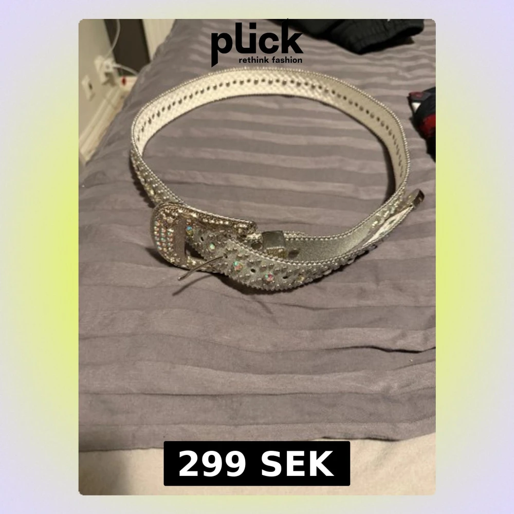 Säljer ett snyggt silverfärgat bälte med glittrande strassdetaljer och dekorativa nitar längs hela kanten. Bältet har en bred, glittrig spänne och är gjort i syntetmaterial med en ljus insida. Perfekt för dig som vill sticka ut med lite extra bling.