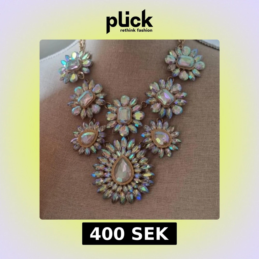 Superfint statement-halsband med stora, glittriga stenar i regnbågsskimrande färger. Halsbandet har flera blommiga former med både droppformade och fyrkantiga stenar, infattade i guldfärgad metall. Perfekt för att sticka ut och ge extra bling till din outfit.