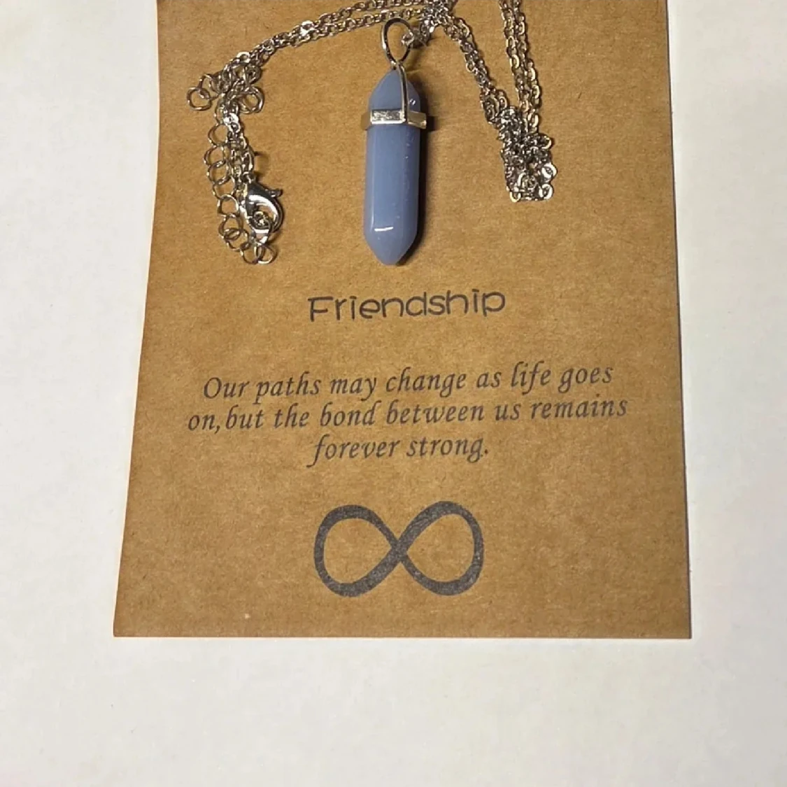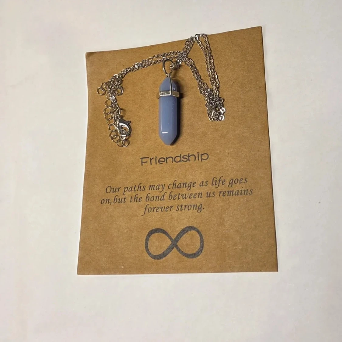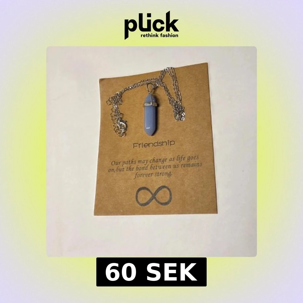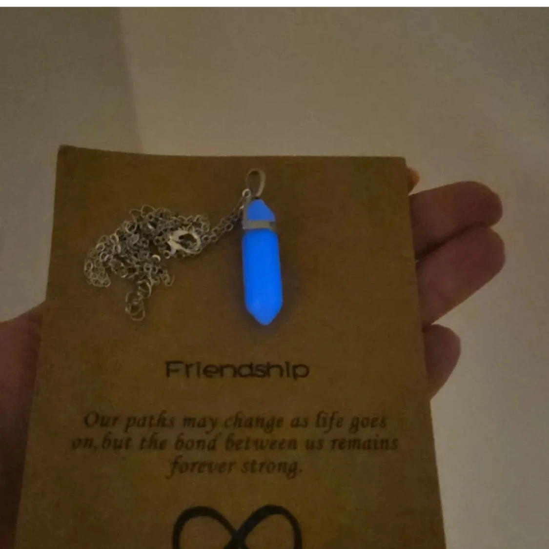 Unikt halsband med en ljusblå kristallformad berlock som lyser starkt blått i mörkret. Hängs i en tunn silverfärgad kedja. Perfekt accessoar för dig som vill sticka ut och visa din personlighet.