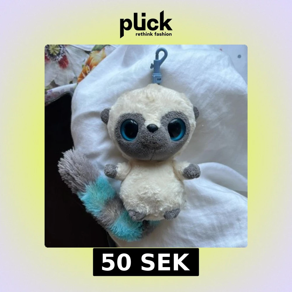 Nyckelring i form av en lemur från yoohoo & friends. Det finns en dragkedja med en liten ficka på baksidan. Ögonen har slitits lite men annars är varan i bra skick. 30 cm lång om man räknar med svansens längd. Huvudet är 11 cm brett och kroppen är 7 cm bred. 🍁🍂