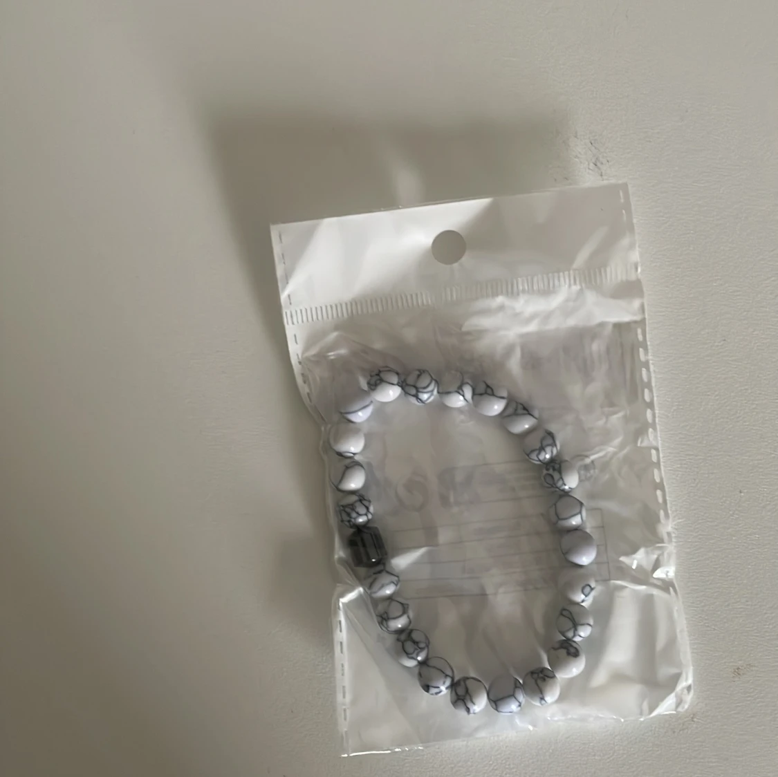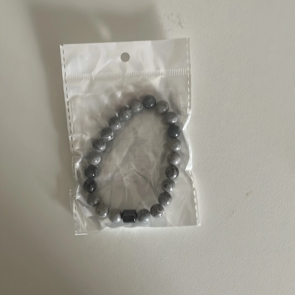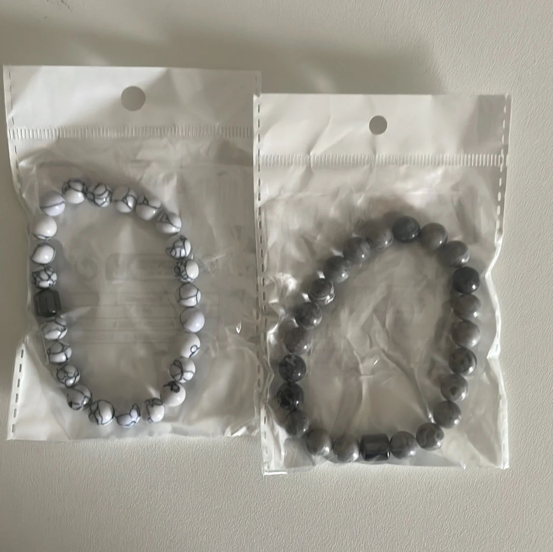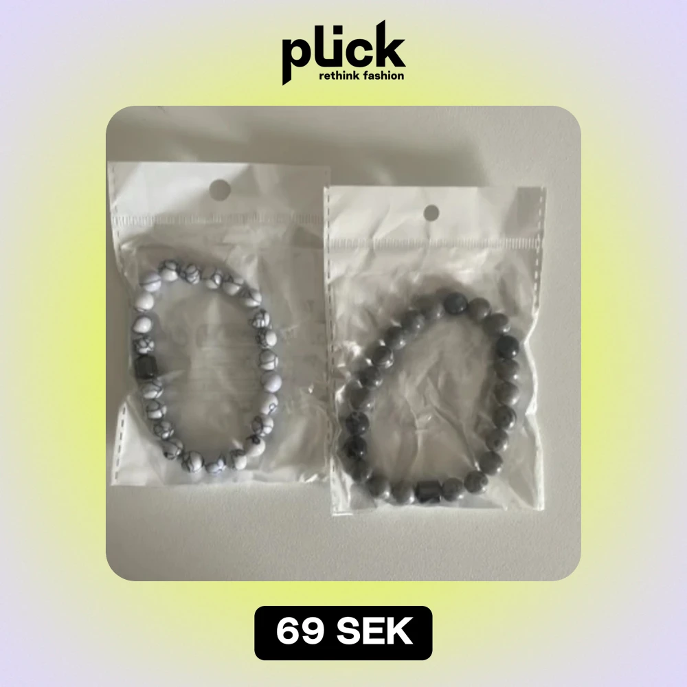 Två armband med pärlor, ett i grått och ett i vitt med grå marmorering. Båda armbanden har elastiska band för enkel passform. Ett armband för 49 två för 59. Pris går att diskutera