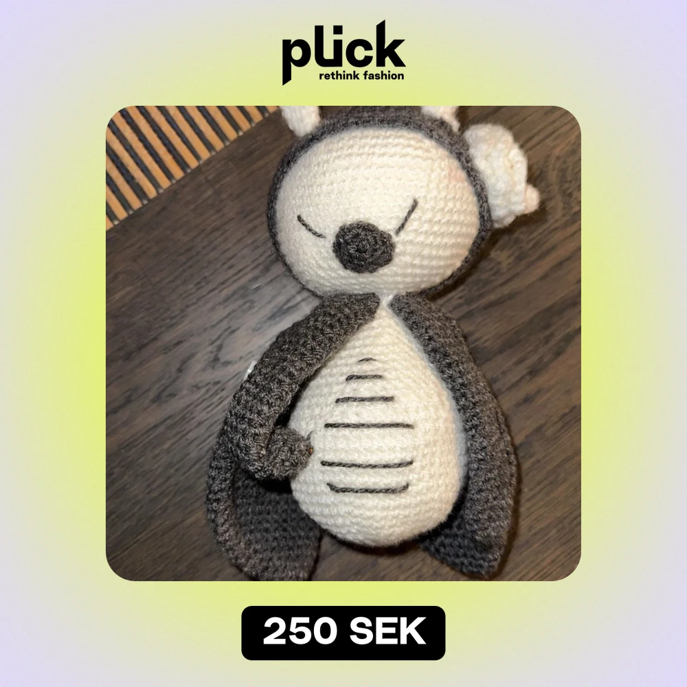 Säljer en supergullig handgjord virkad leksak i form av en liten varelse med grå och vit kropp. Den har små öron och vingar dekorerade med vita knappar. Perfekt som present eller dekoration i barnrummet!
