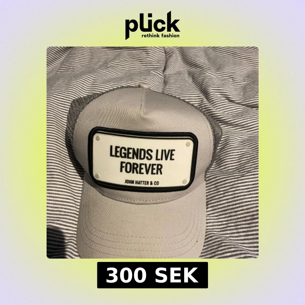 Snygg grå keps med svart och vit patch framtill med texten 'Legends Live Forever'. Kepsen har mesh baktill och justerbar knäppning för perfekt passform. Perfekt accessoar för en cool och avslappnad stil. Använd ungefär 3 gånger och väldigt bra skick,hör av er vid funderingar.pris kan diskuteras