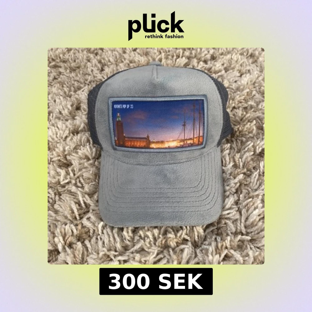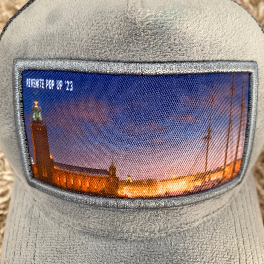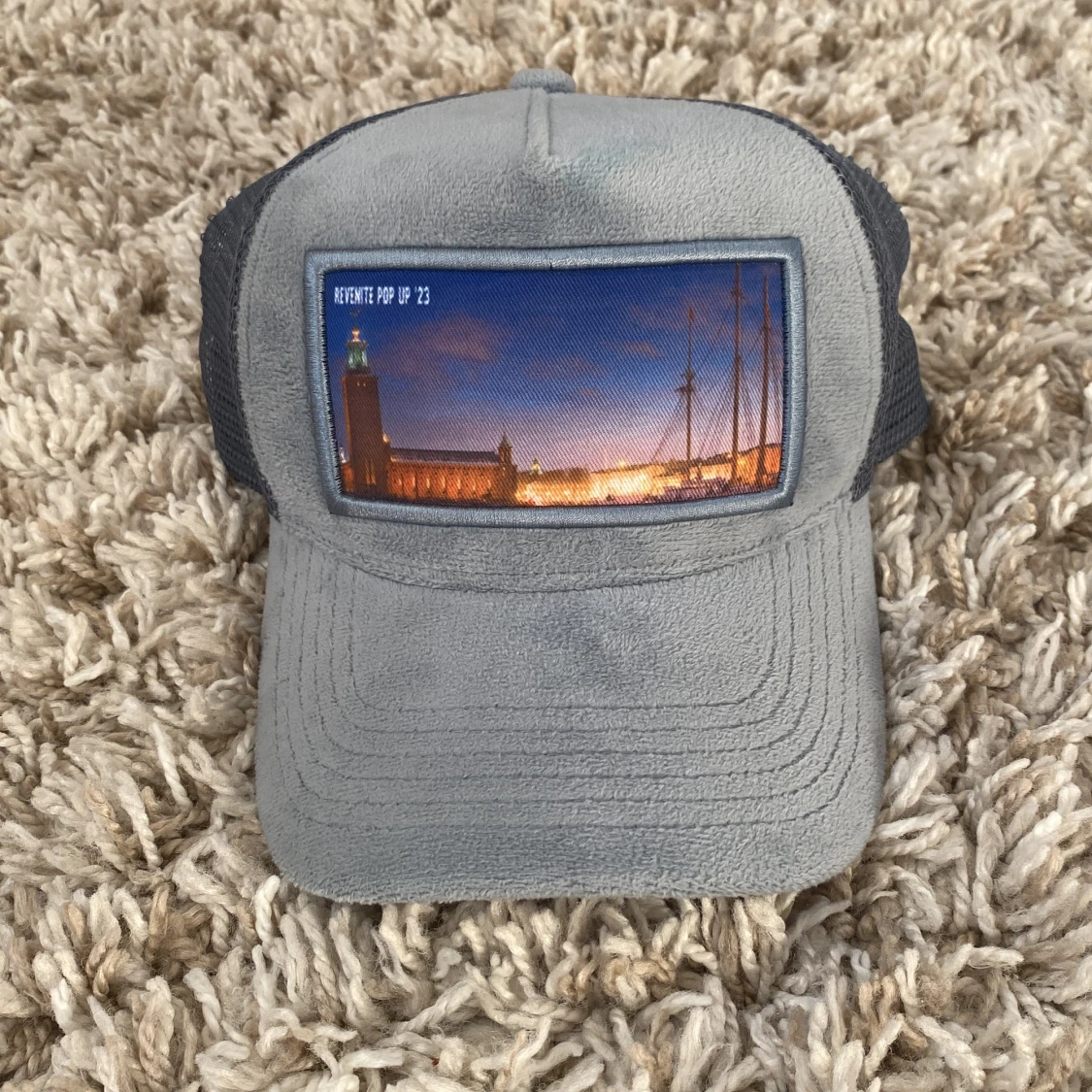 Snygg grå keps från Revenite med mesh på sidorna och baksidan. Framtill finns en stor patch med ett färgstarkt foto av Stockholms stadshus i solnedgång. Kepsen har klassisk böjd skärm och justerbar passform. Perfekt för dig som gillar unik streetstyle. Den köptes på revenites pop-up butik sommaren 2023 och nypris är 500. Den är signerad av revenite på insidan.