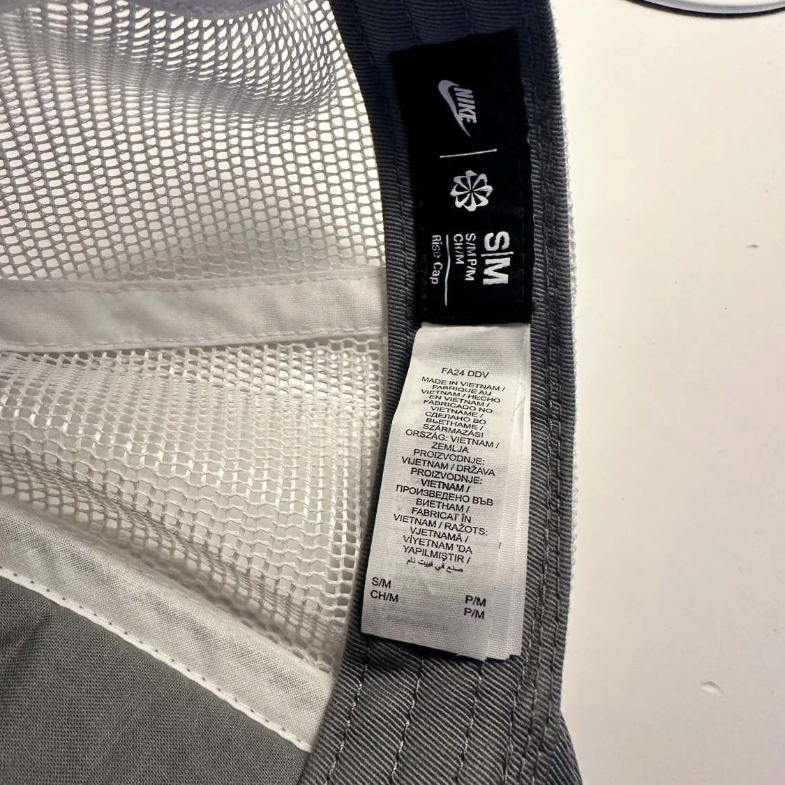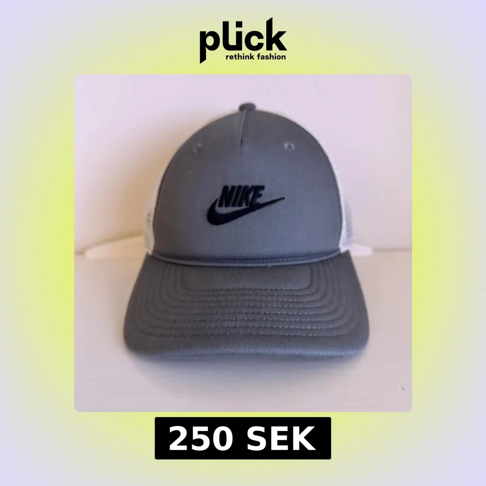 Snygg grå keps från Nike med svart broderad logga framtill. Framsidan är i slät bomull och baksidan har vit mesh för extra ventilation. Böjd skärm och justerbar passform gör den perfekt för en sportig look.
