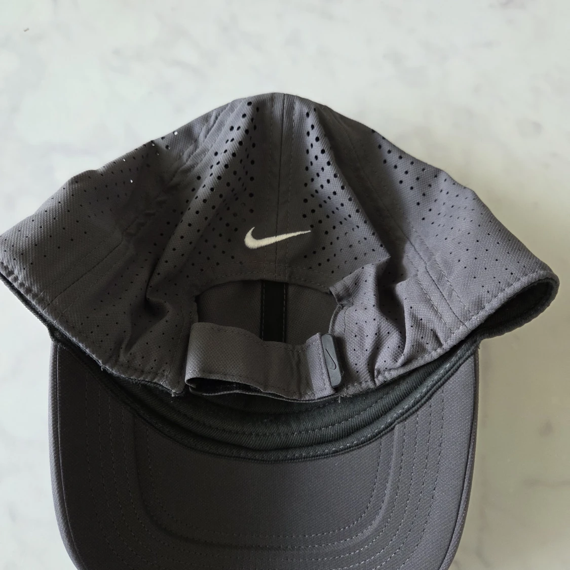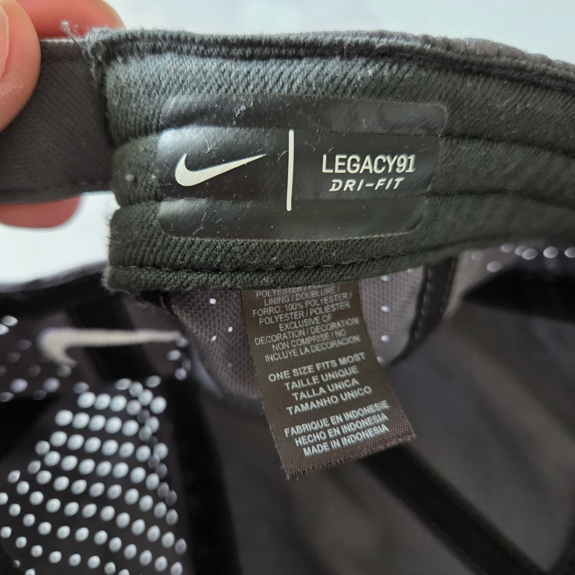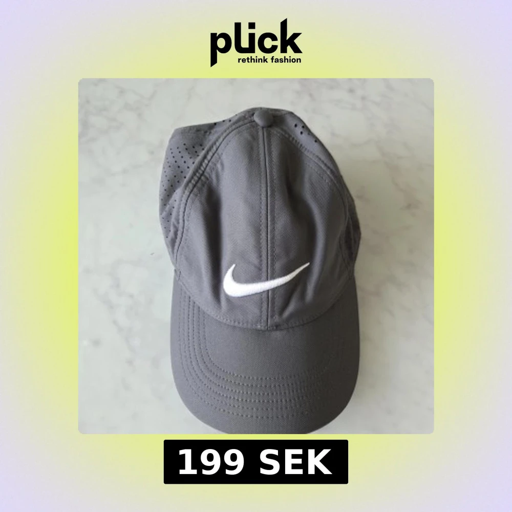 Snygg grå keps från Nike, modell Legacy91 Dri-Fit. Kepsen har vit broderad swoosh-logga fram och bak, justerbar rem och ventilerande perforerade paneler på sidorna. Tillverkad i lätt polyester som andas, perfekt för aktiva dagar.