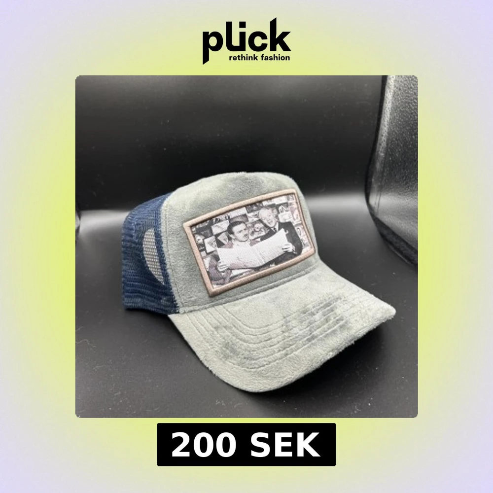 Snygg truckerkeps i grått och marinblått med mesh på sidorna och baksidan. Framtill finns en stor patch med svartvitt fototryck av två personer. Kepsen har böjd skärm och cool retrostil, perfekt för att lyfta din streetwear-look.