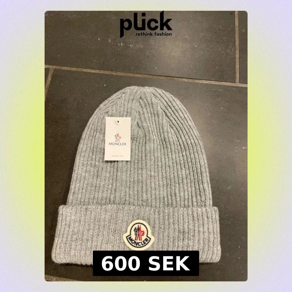 Snygg grå ribbstickad mössa från Moncler med uppvikt kant och klassisk Moncler-logga framtill. Mössan är tillverkad i mjuk ull och har en enkel, stilren design som passar perfekt till kalla dagar.