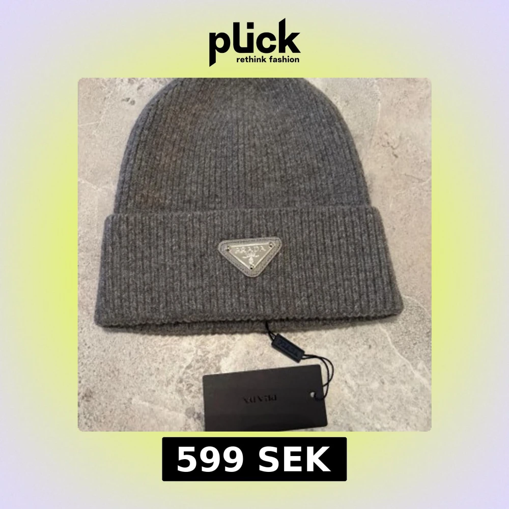 Snygg grå ribbad mössa från Prada med en elegant broderad logotyp framtill. Perfekt för att hålla dig varm och stilren under kyliga dagar.