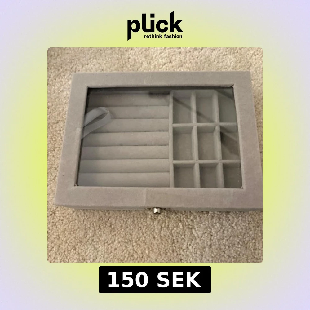 Snygg och stilren smyckesbox i ljusgrå sammet med glaslock. Perfekt för att organisera ringar, örhängen och andra småsmycken. Boxen har flera fack och mjuka rader för att hålla dina favoriter på plats. Liten metallknäppning framtill.