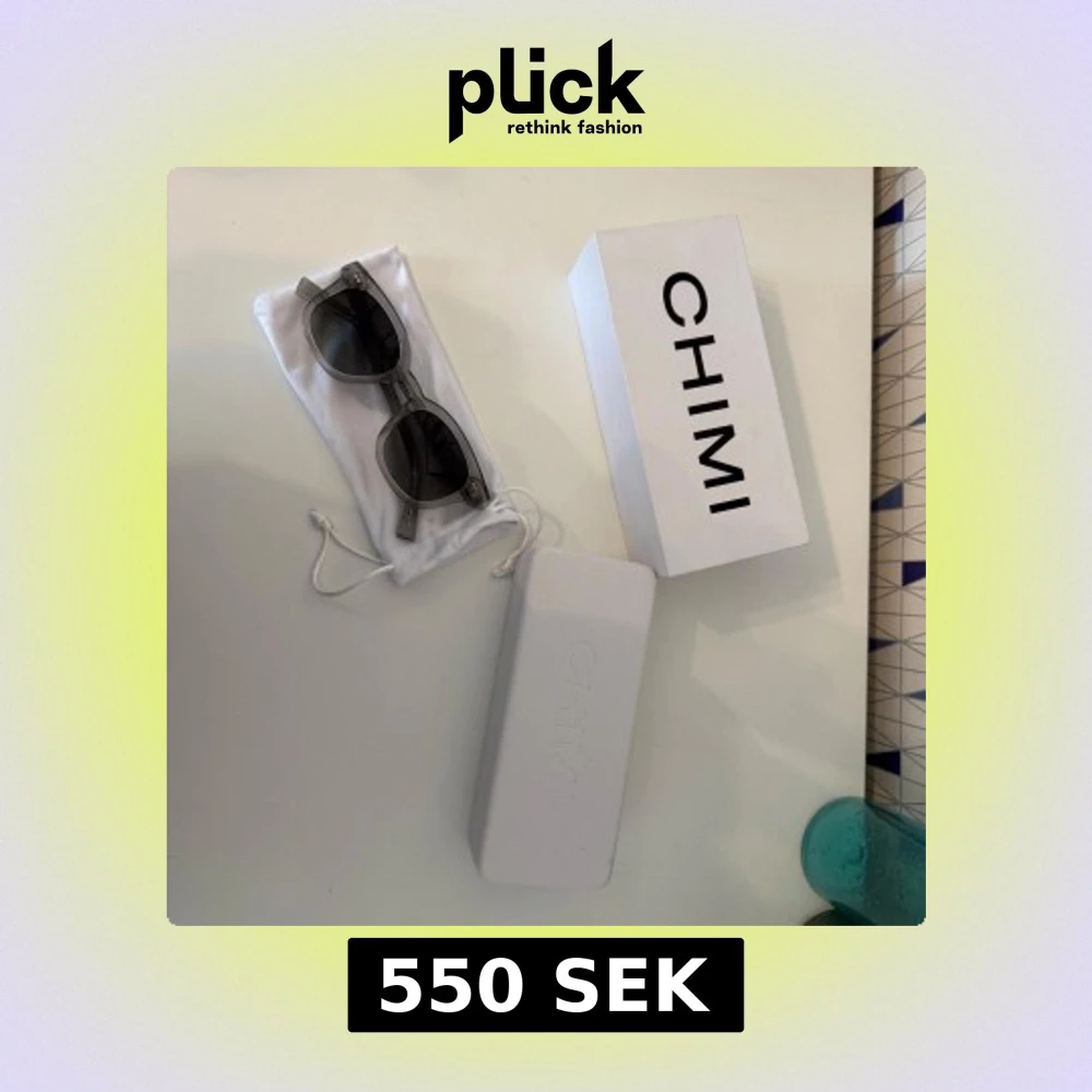 Snygga grå solglasögon från CHIMI med transparent båge och mörka linser. Perfekta för en stilren look. Kommer med originalförpackning och fodral.