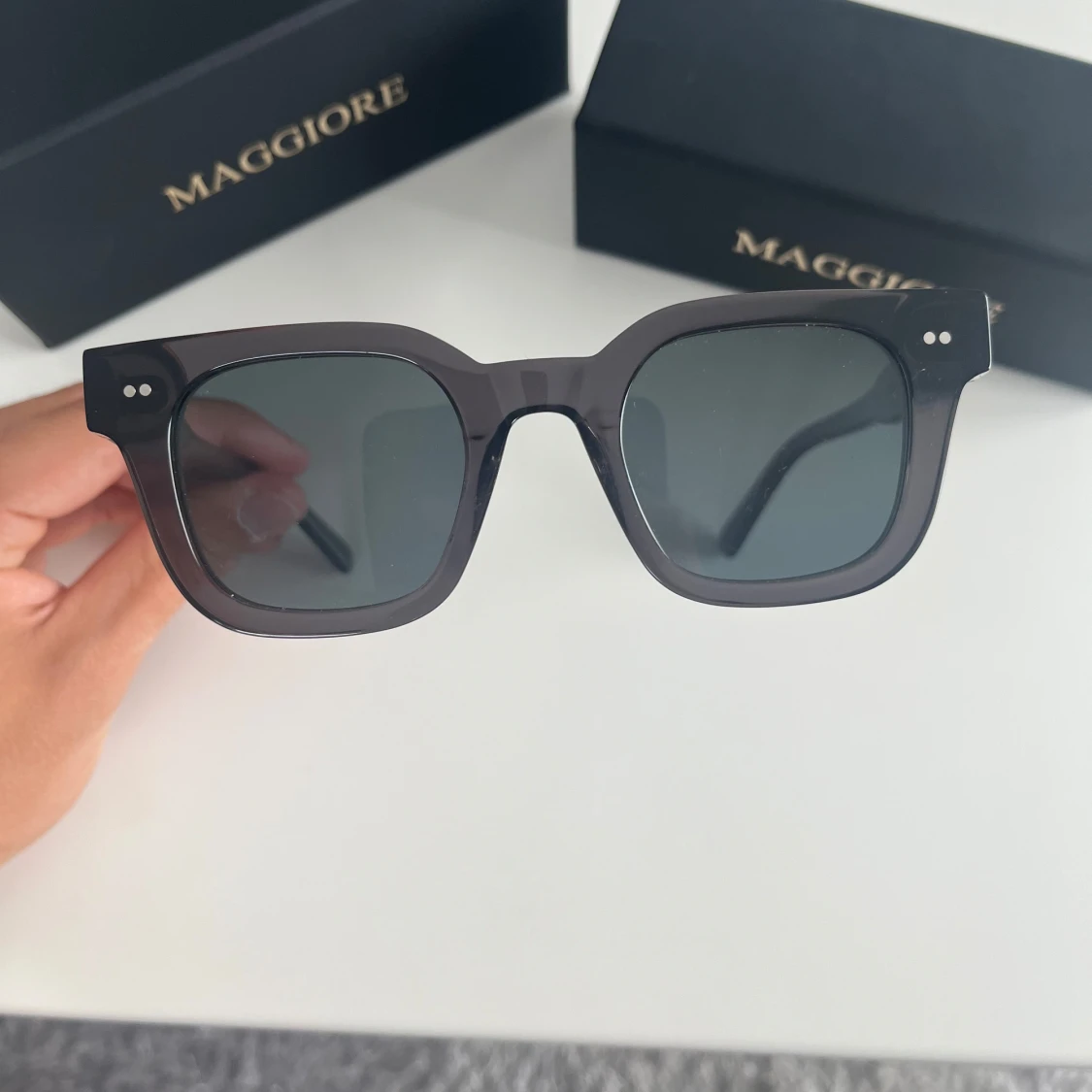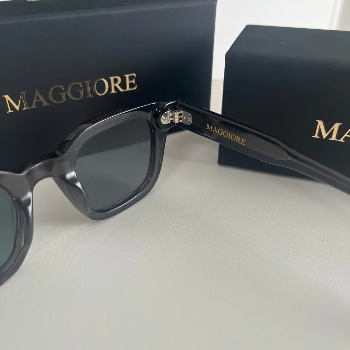 Stilrena gråa solglasögon från Maggiore med fyrkantig form och tjock båge. Snygga detaljer i guld på skalmarna och mörka glas. Perfekta för dig som vill ha en modern och clean look. Kommer med originalförpackning.
