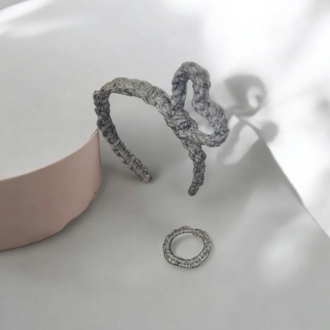 Snyggt grått diadem med knuten makramé och dekorativt hjärta och en matchande scrunchie. Perfekt för att ge en stilren touch till din frisyr.