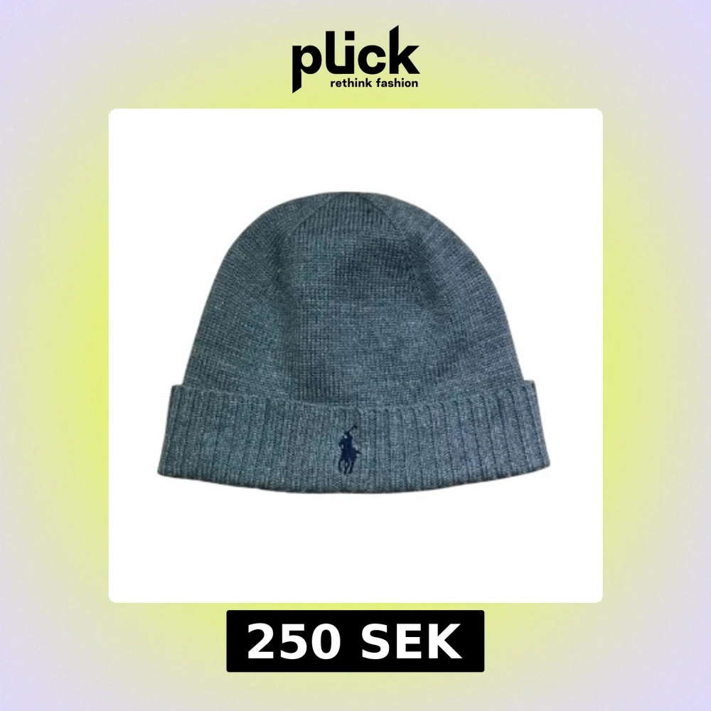 Snygg grå mössa från Polo Ralph Lauren i tvättbar merinoull. Den har en ribbad kant och är broderad med den klassiska logotypen i mörkblått.