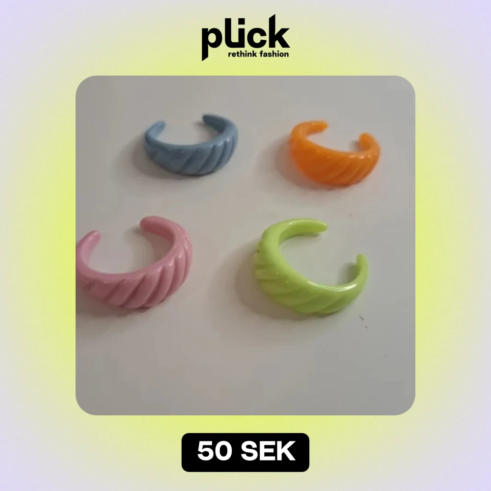 Fyra färgglada ringar i plast med en vriden design. Ringarna finns i färgerna blå, orange, rosa och grön.