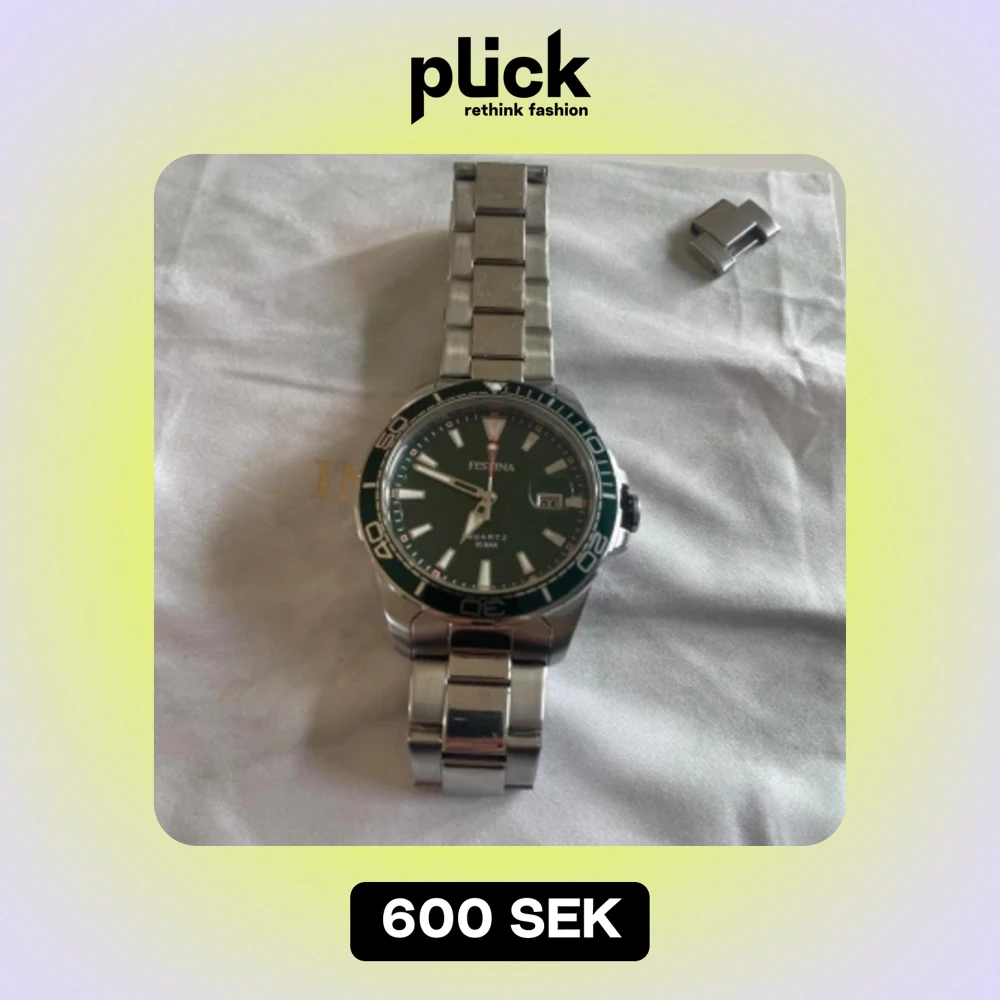 Det är en festina klocka med grön urtavla. Inga skador på klockan men armbandet är lite repat. Säljer klockan då jag inte använder den. En extra länk kommer vid köp.
