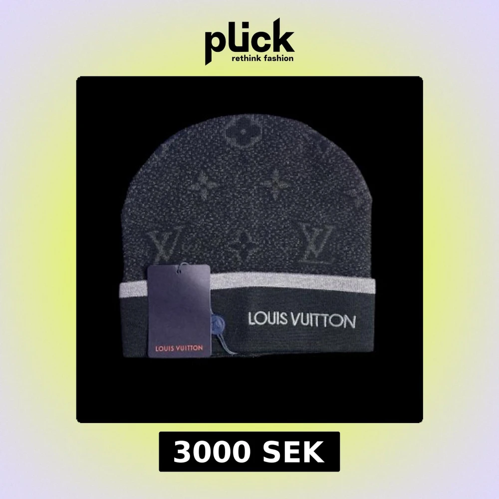 Snygg svart mössa från Louis Vuitton med klassiskt monogrammönster och broderad logga framtill. Mössan har en grå rand och är tillverkad i mjukt stickat material som håller dig varm och stilren under kalla dagar.