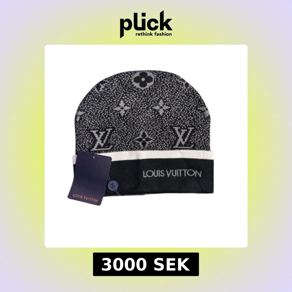 Snygg svart och vit mössa från Louis Vuitton med ikoniskt monogrammönster och broderad logga framtill. Mössan har en bred uppvikt kant och är stickad i mjukt material, perfekt för att lyfta din vinterstil.