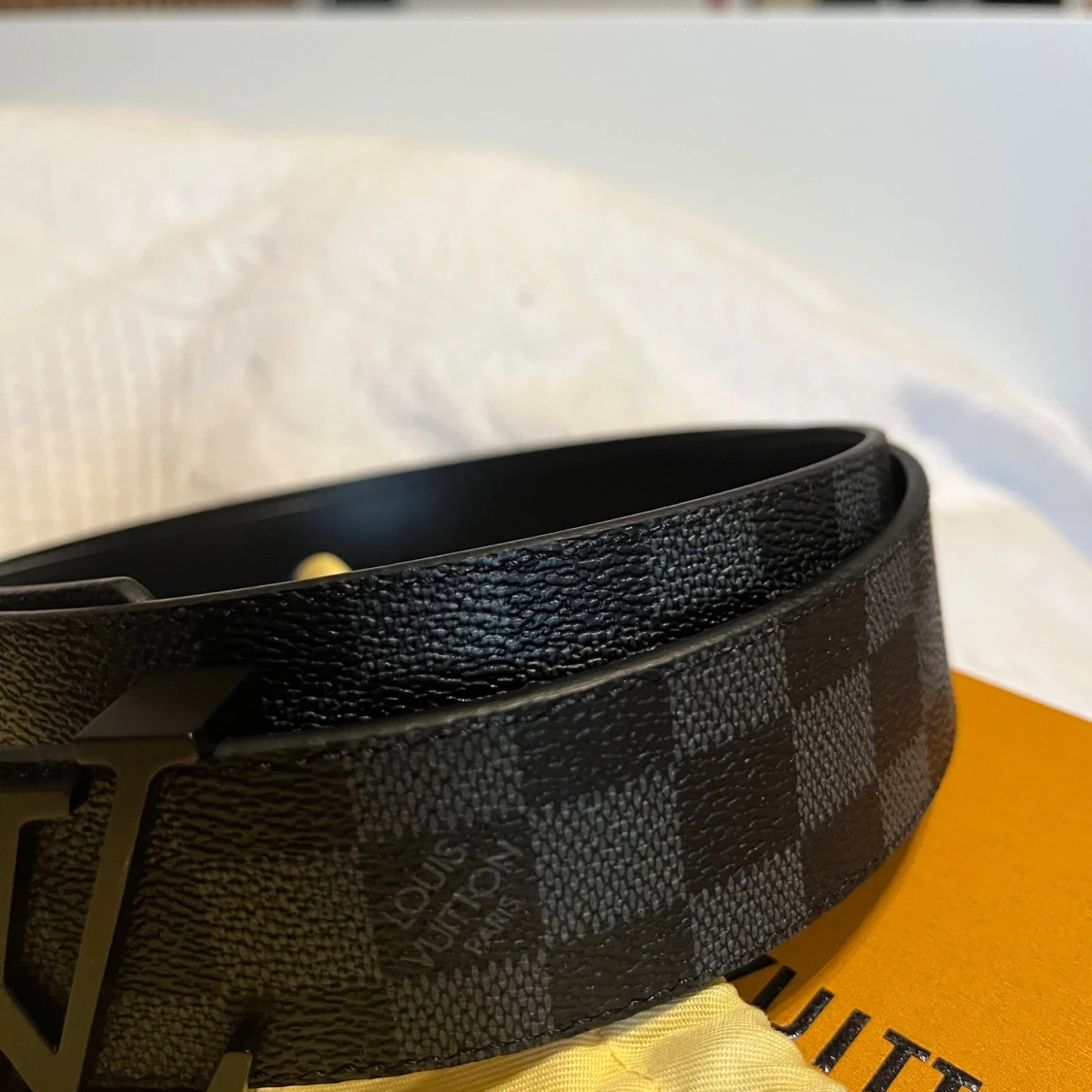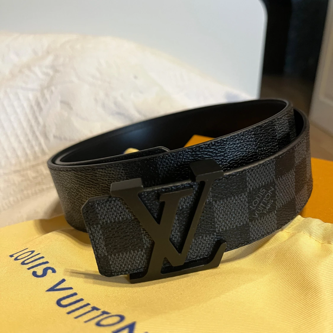 Snyggt svart bälte från Louis Vuitton med klassiskt rutigt mönster och stor LV-logga i metall som spänne. Bältet kommer i original ask, dustbag och med blått Louis Vuitton-band. Perfekt accessoar för att lyfta din outfit. 110cm