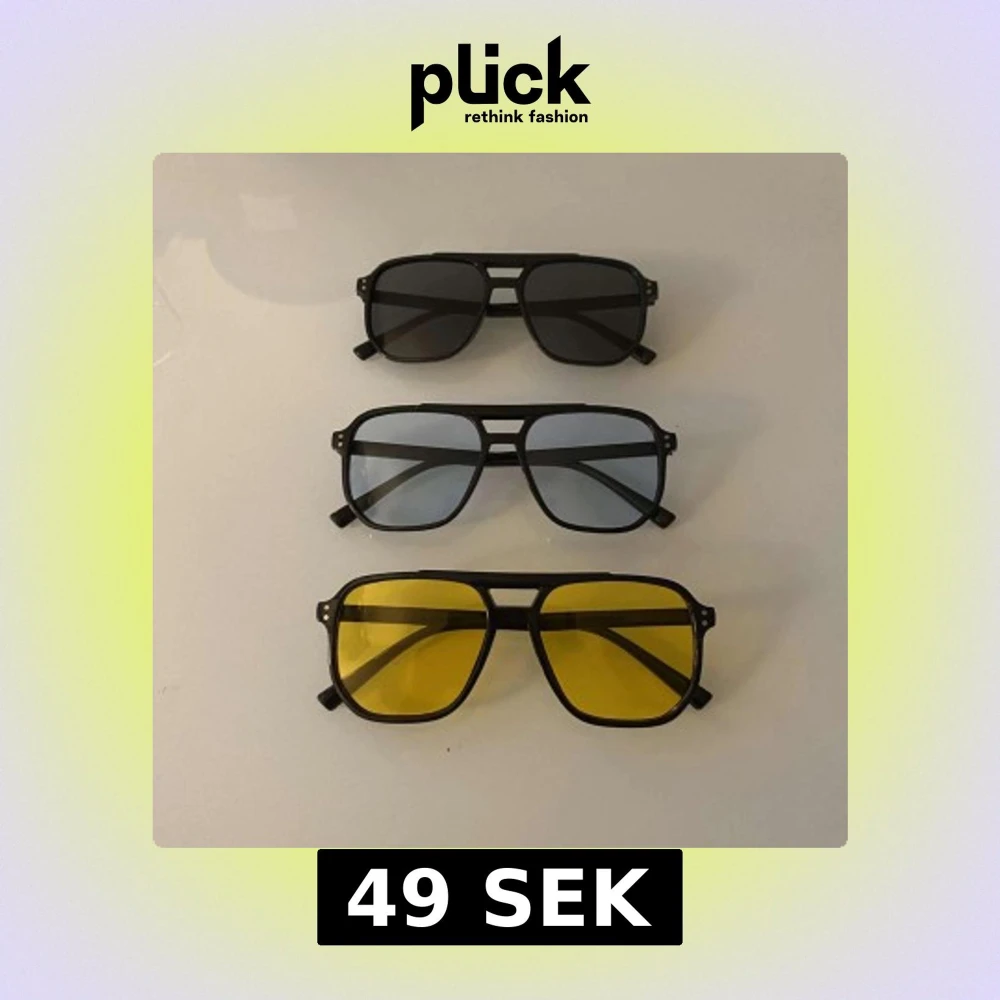 Tre par pilotglasögon med svart ram och olika färgade linser: ett med mörkgrå, ett med ljusblå och ett med gul lins. Snygg retrostil med breda bågar och dubbla bryggor. Perfekt för dig som vill sticka ut med coola färgade glas.