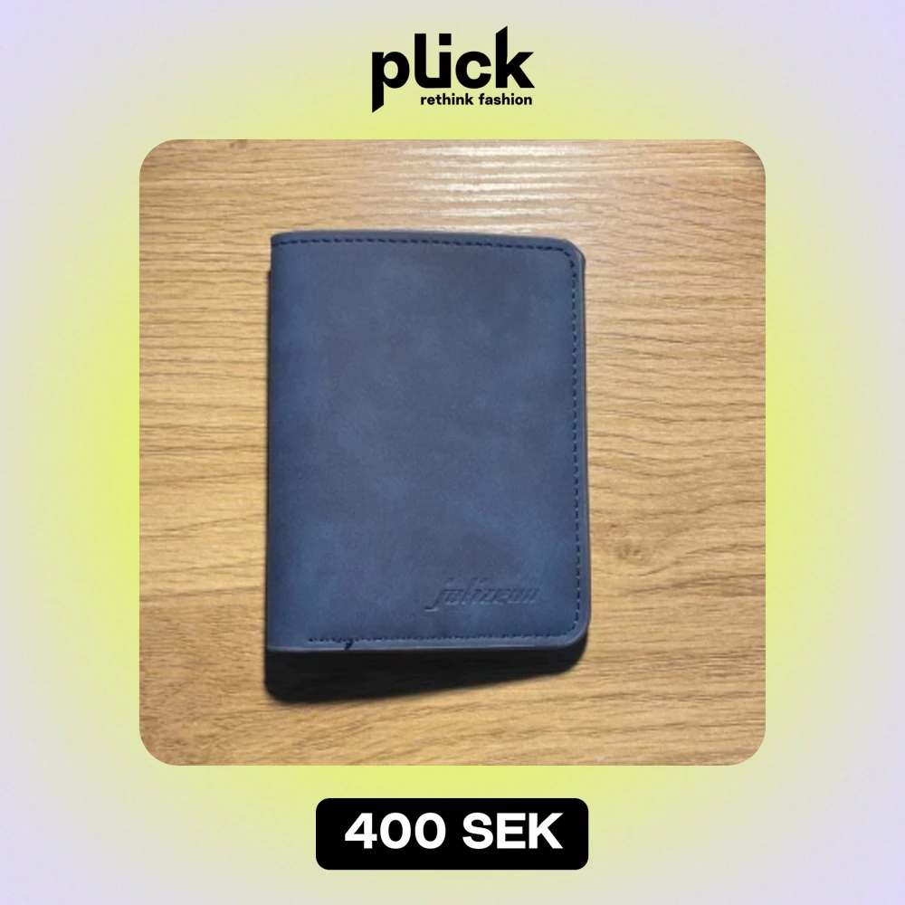 Säljer en stilren blå plånbok i skinn. Den har flera kortfack och en genomskinlig ficka för ID eller foto. Perfekt för att hålla ordning på dina kort och kontanter.
