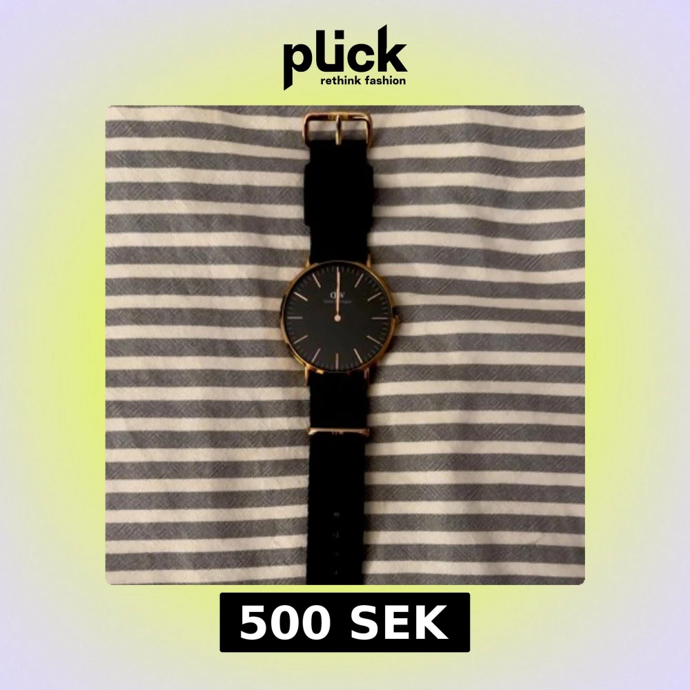 Klocka från Daniel Wellington med svart urtavla och guldfärgad boett. Behöver nytt batteri. Priset går att diskutera.