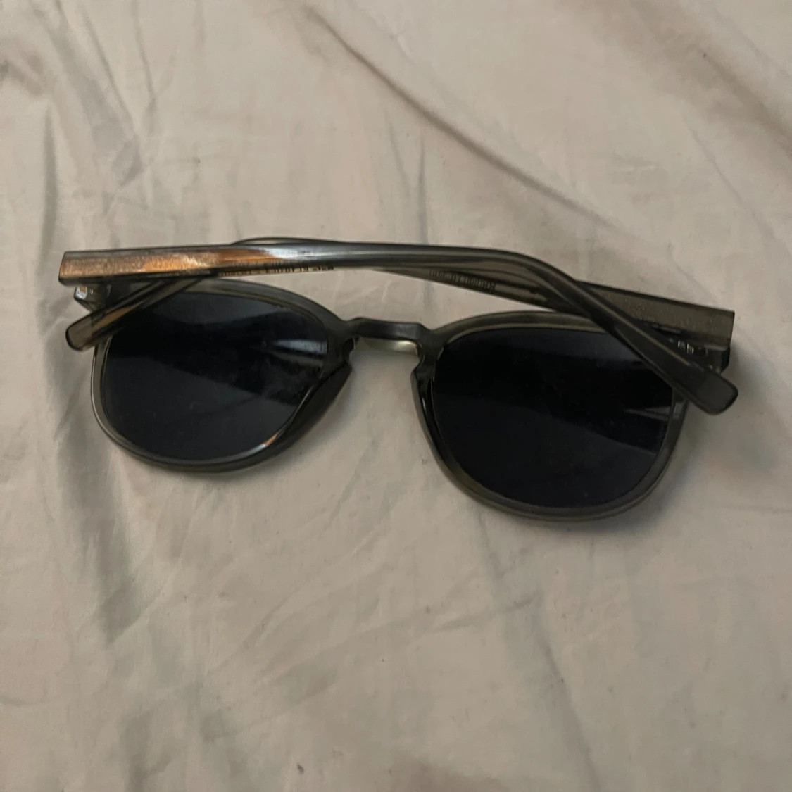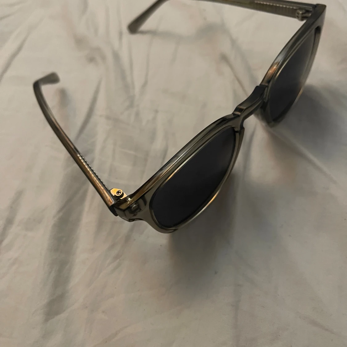 Snygga solglasögon med svarta linser och transparent gråbrun båge i klassisk rundad form. Bågen har en cool brygga och detaljer i metall vid gångjärnen. Perfekt accessoar för att höja din stil.