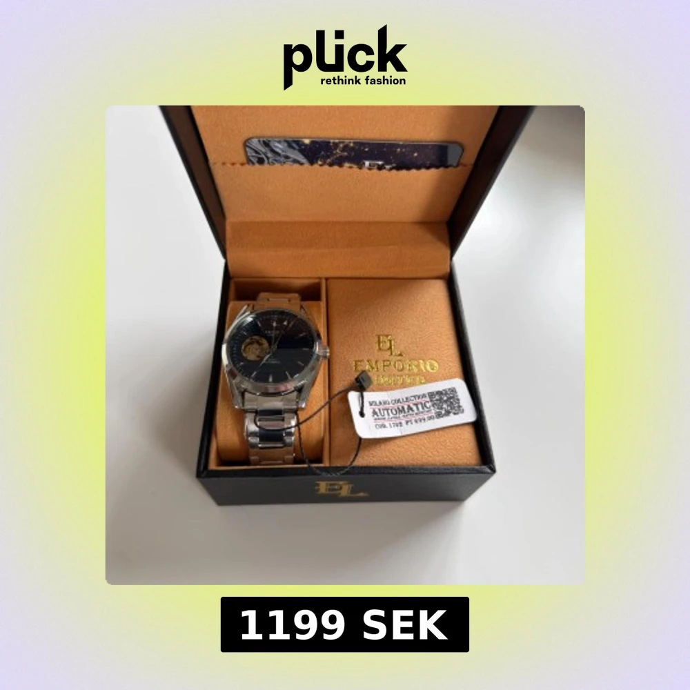Snygg italiensk automatisk klocka från Emporio Limited med blå urtavla och silverfärgat armband i metall. Urtavlan har ett öppet fönster som visar mekanismen och markerade index. Klockan levereras i originalask med märkning och etikett. (Köpt från Milano Italien)