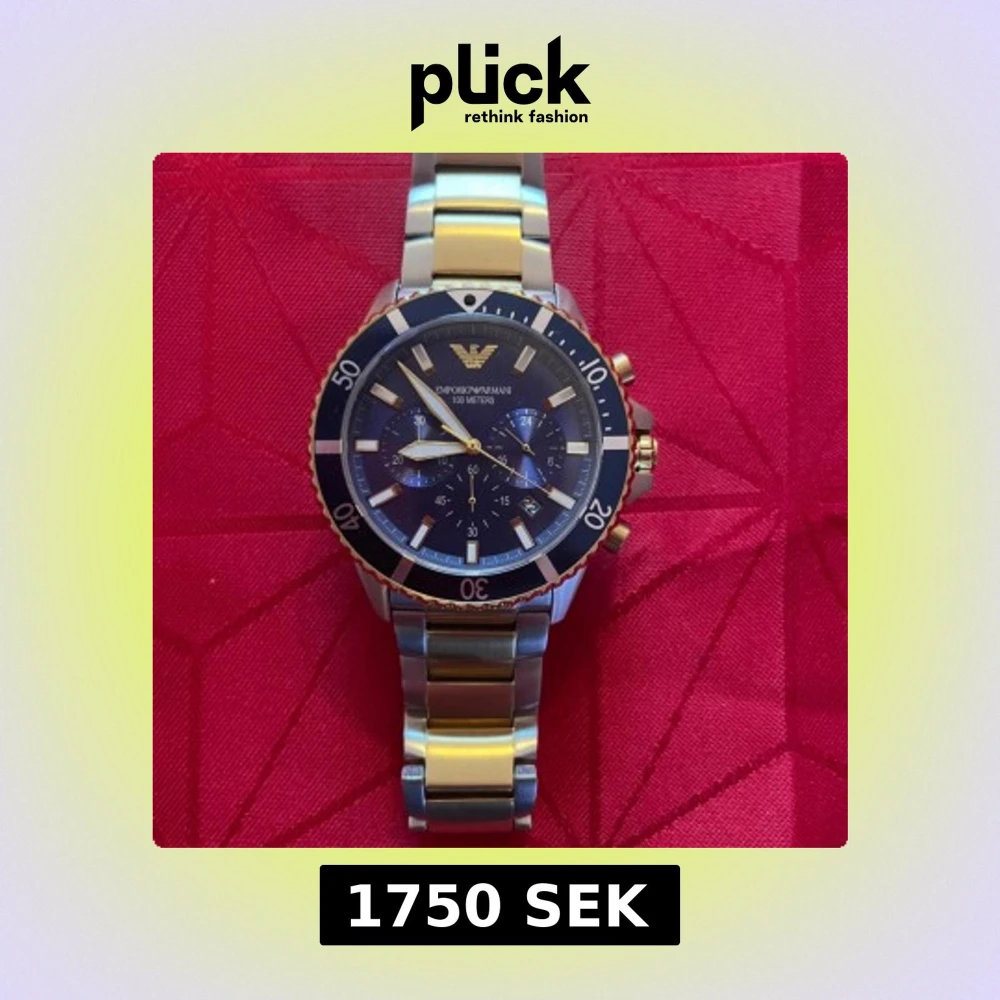 Snygg klocka från Emporio Armani med blå urtavla, gulddetaljer och silverfärgad länk i metall. Klockan har kronograf, datumvisning och tydliga indexmarkeringar. Boetten är rund med guldfärgad kant och robust känsla. Perfekt accessoar för dig som gillar stilren design. NY PRIS 4600kr även boxen medföljer och länkarna som jag tagit av för den ska passa mig