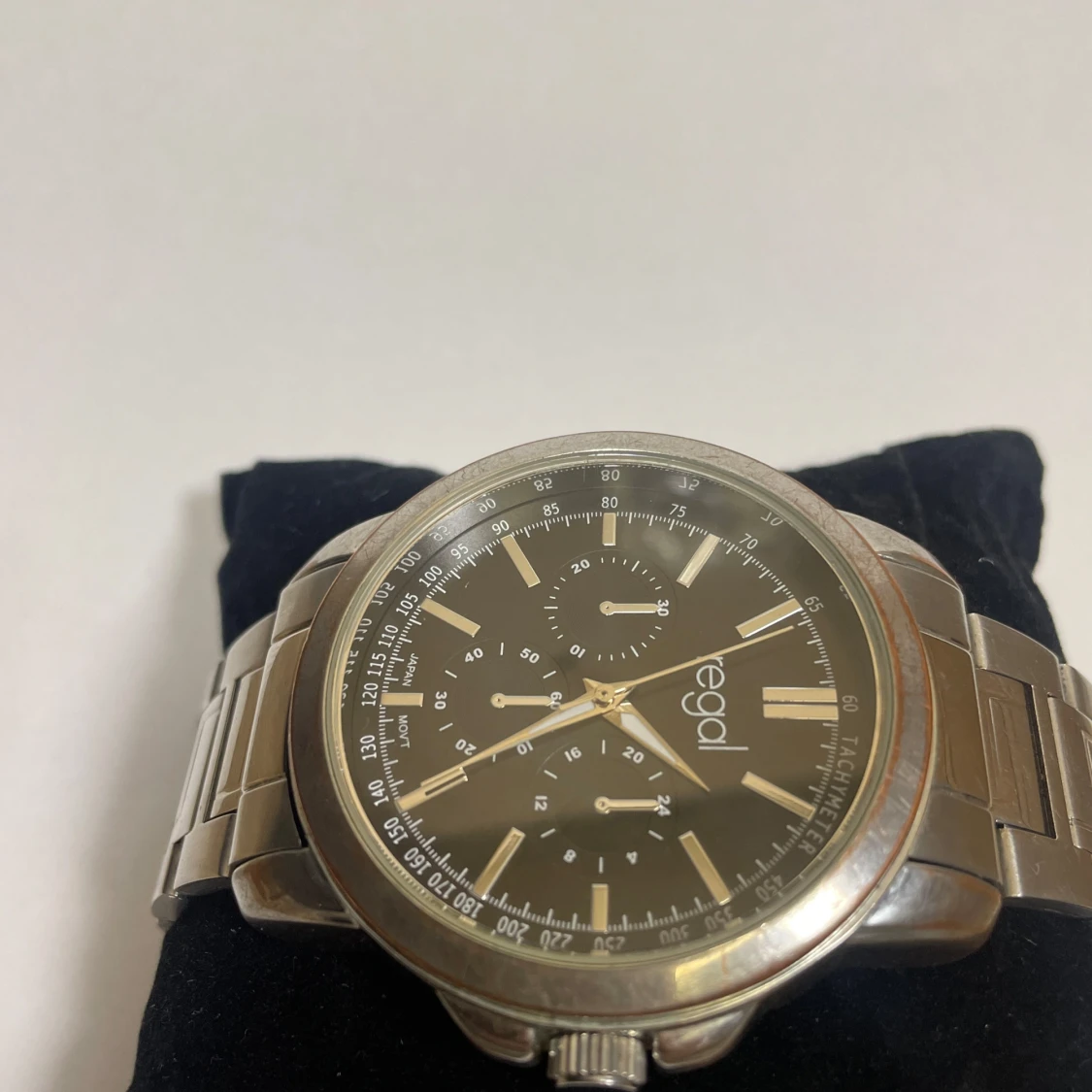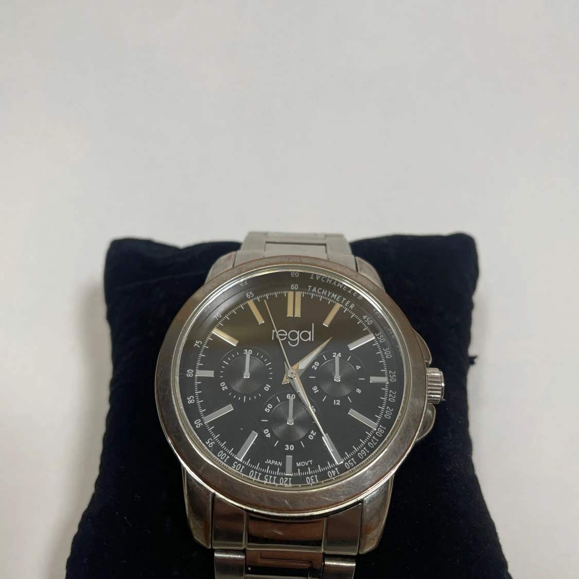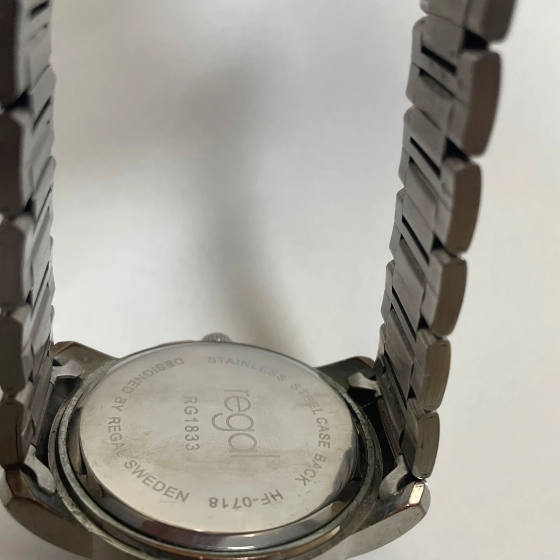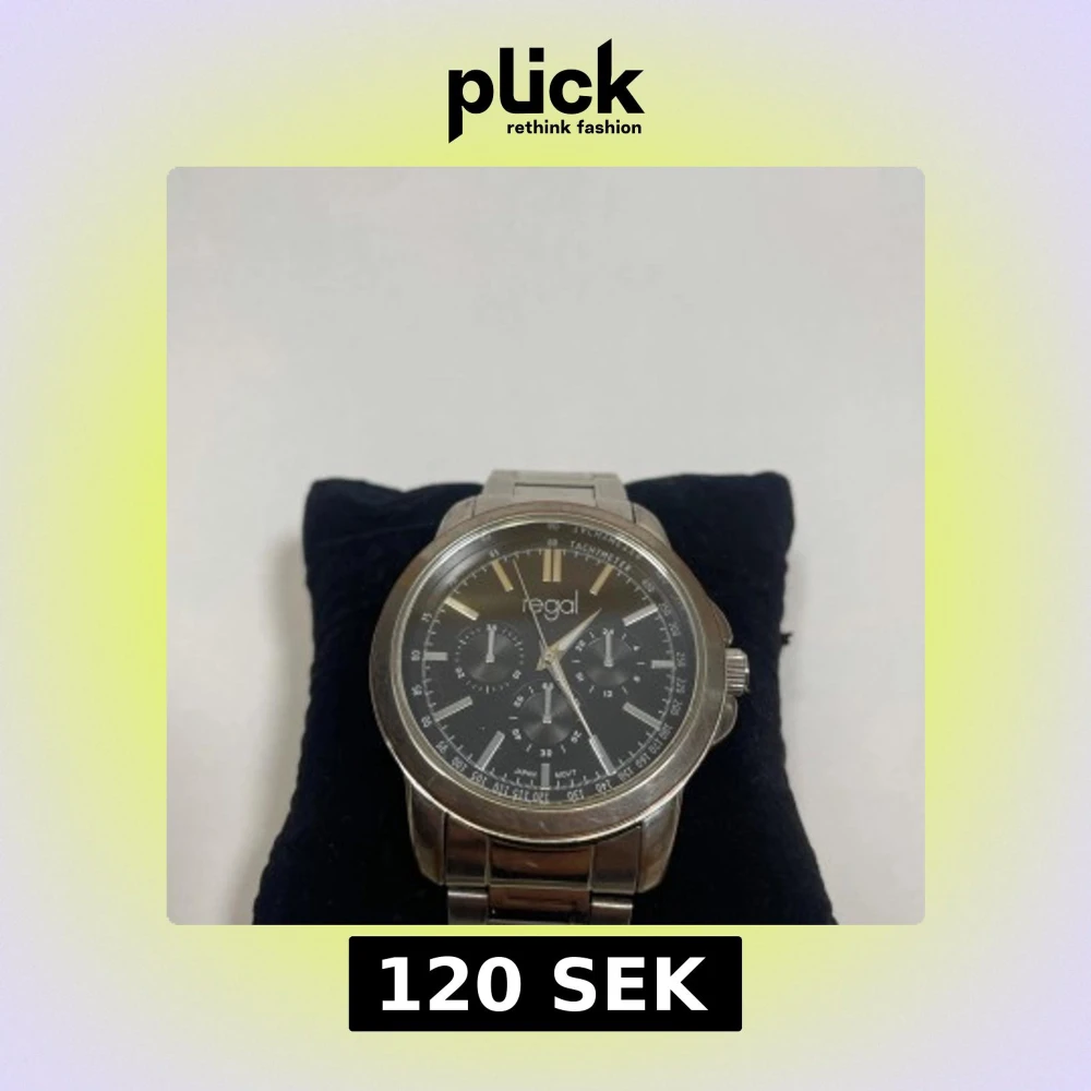Stilren klocka från Regal med svart urtavla. Okej skick syns i bilden mer bilder kan lösas. Bateri behöver bytas. Storlek syns, den kan även annpassas