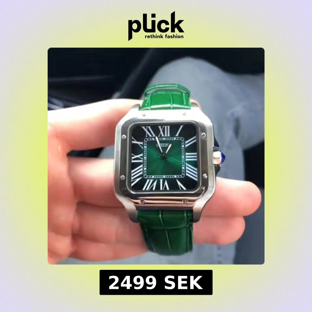 Stilren klocka med fyrkantigt silverfärgat boett, grön urtavla med romerska siffror och grönt skinnarmband. Automatisk rörelse, safirglas och 40mm boett. Perfekt accessoar för dig som gillar klassisk design med modern twist.