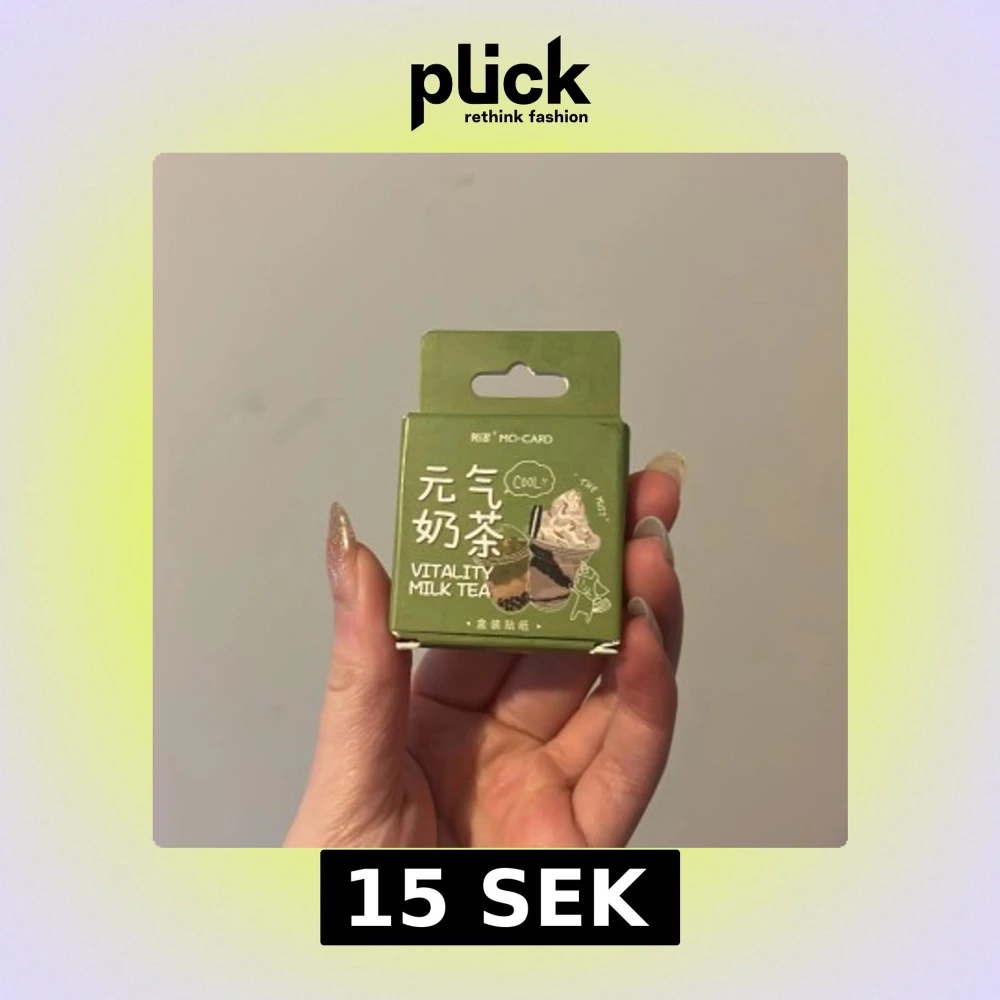 En söt grön förpackning med klistermärken med tema 'Vitality Milk Tea'. Perfekt för att dekorera anteckningsböcker eller brev. Förpackningen har illustrationer av olika drycker och text på både engelska och kinesiska.