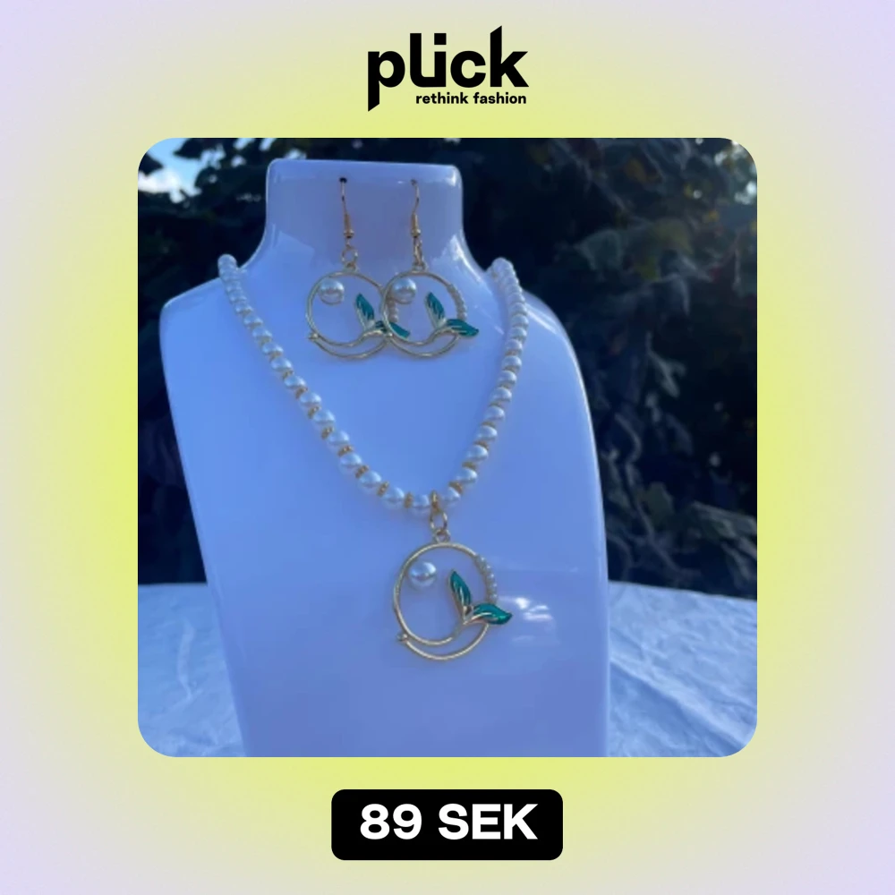 Säljer ett elegant set med ett pärlhalsband och matchande örhängen. Halsbandet har vita pärlor och ett hängsmycke i guld med en stor pärla och gröna blad. Örhängena har samma design med guldfärgade cirklar, en pärla och gröna blad. Perfekt för en festlig kväll eller som en fin present!