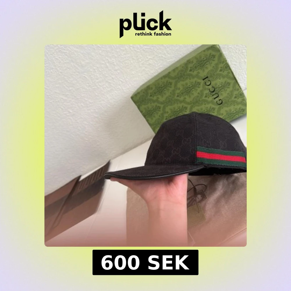Säljer en stilren grön keps från Gucci med ett diskret mönster och röd-gröna detaljer på sidan. Kepsen har justerbar rem baktill för perfekt passform.