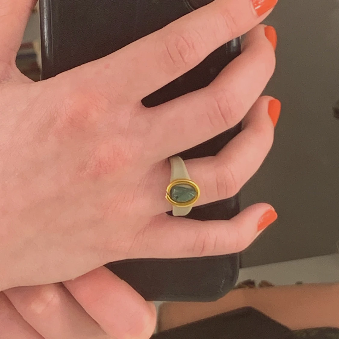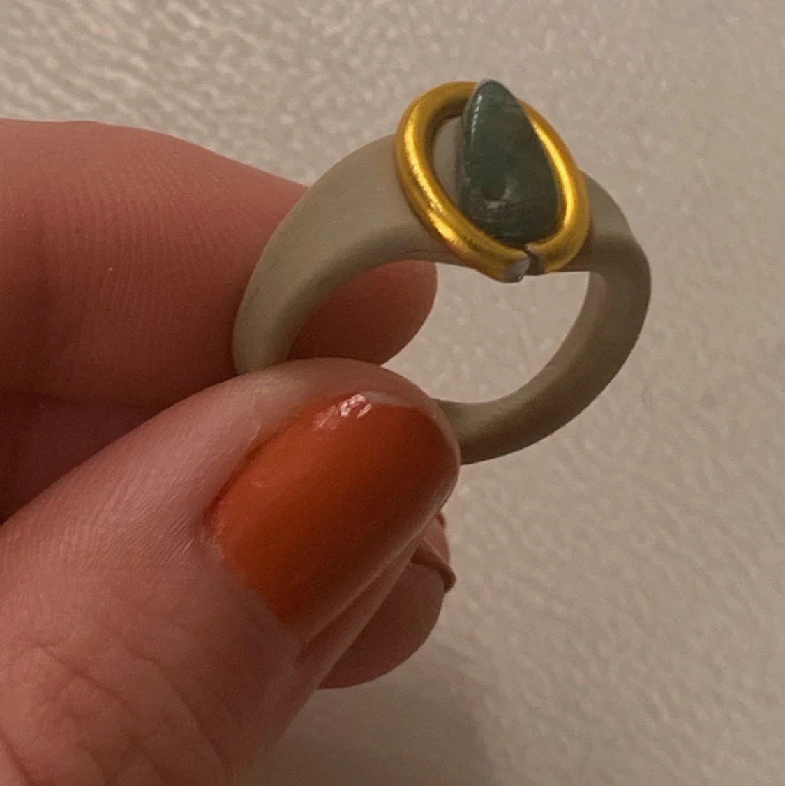 En ring av beige lera med guldig ståltråd och en liten grön kristall! Kristallen är äkta, det är grön aventurin!✨