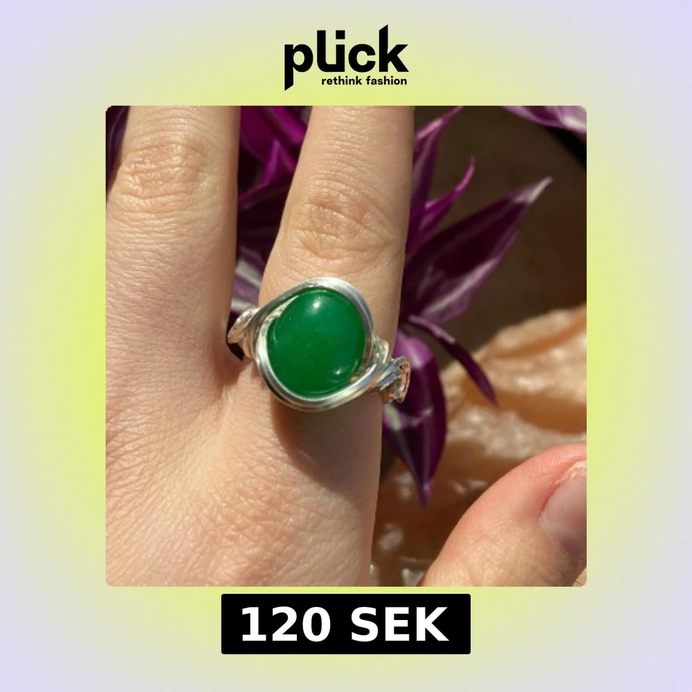 Unik silverring med en stor, rund grön sten i centrum. Ringen har en snygg swirl-design på sidorna som ger den en cool och modern vibe. Perfekt för dig som vill sticka ut med ett statement-smycke.
