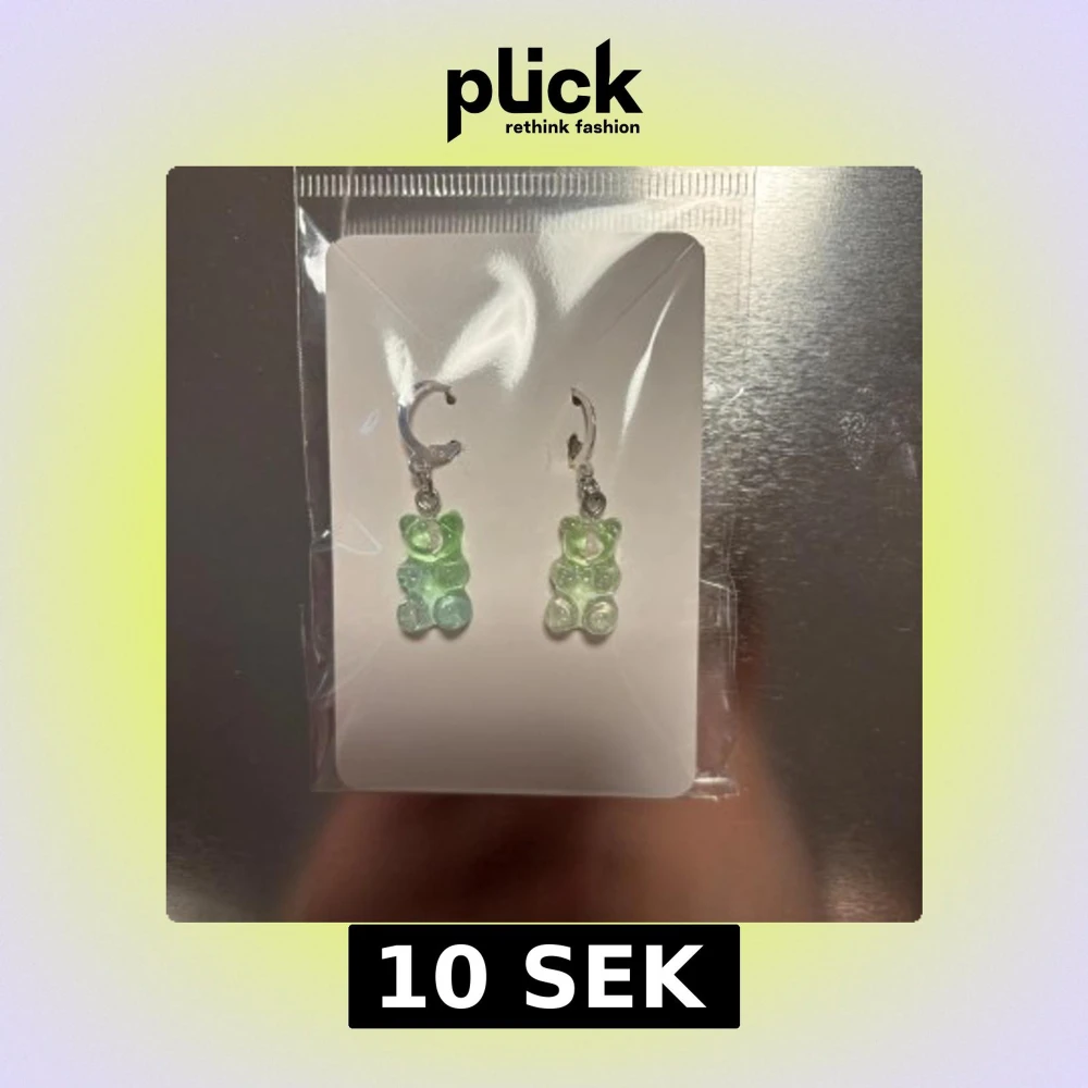 Söta örhängen med hängande gröna nallebjörnar. Perfekta för att lägga till en lekfull touch till din stil. De är fästa på silverfärgade krokar. (Billigt material)