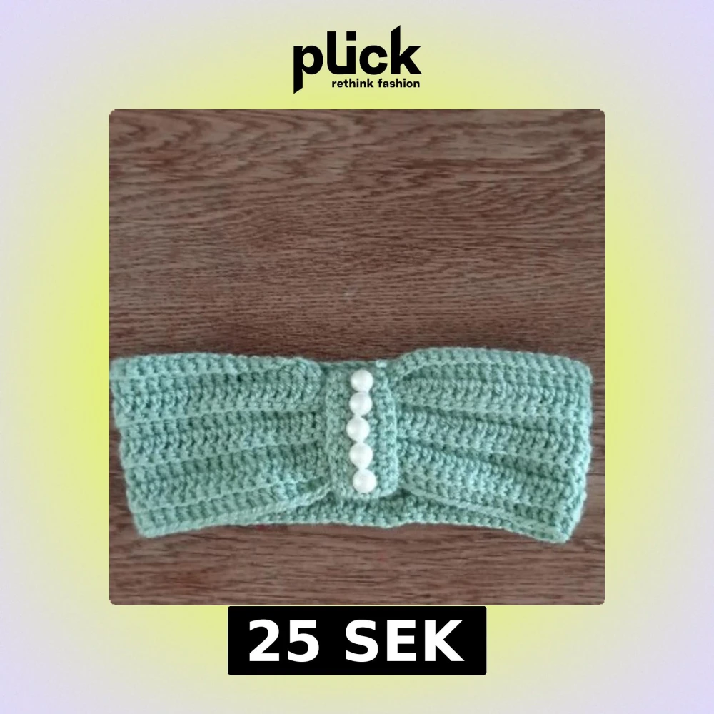Snyggt grönt virkad pannband med dekorativa vita pärlor framtill. Hemmagjord. Skriv gärna om du vill ha mer information om pannbandet