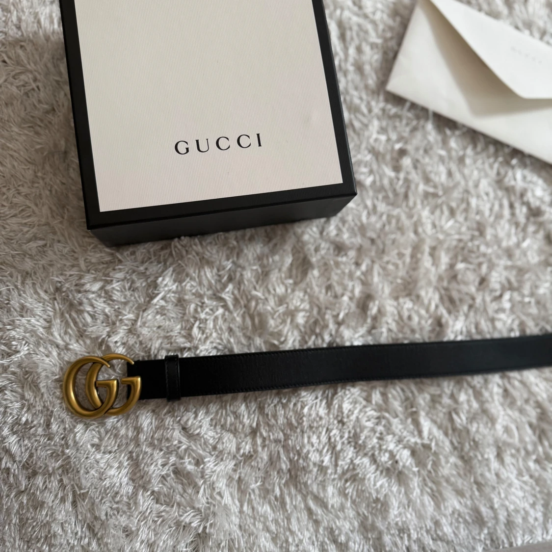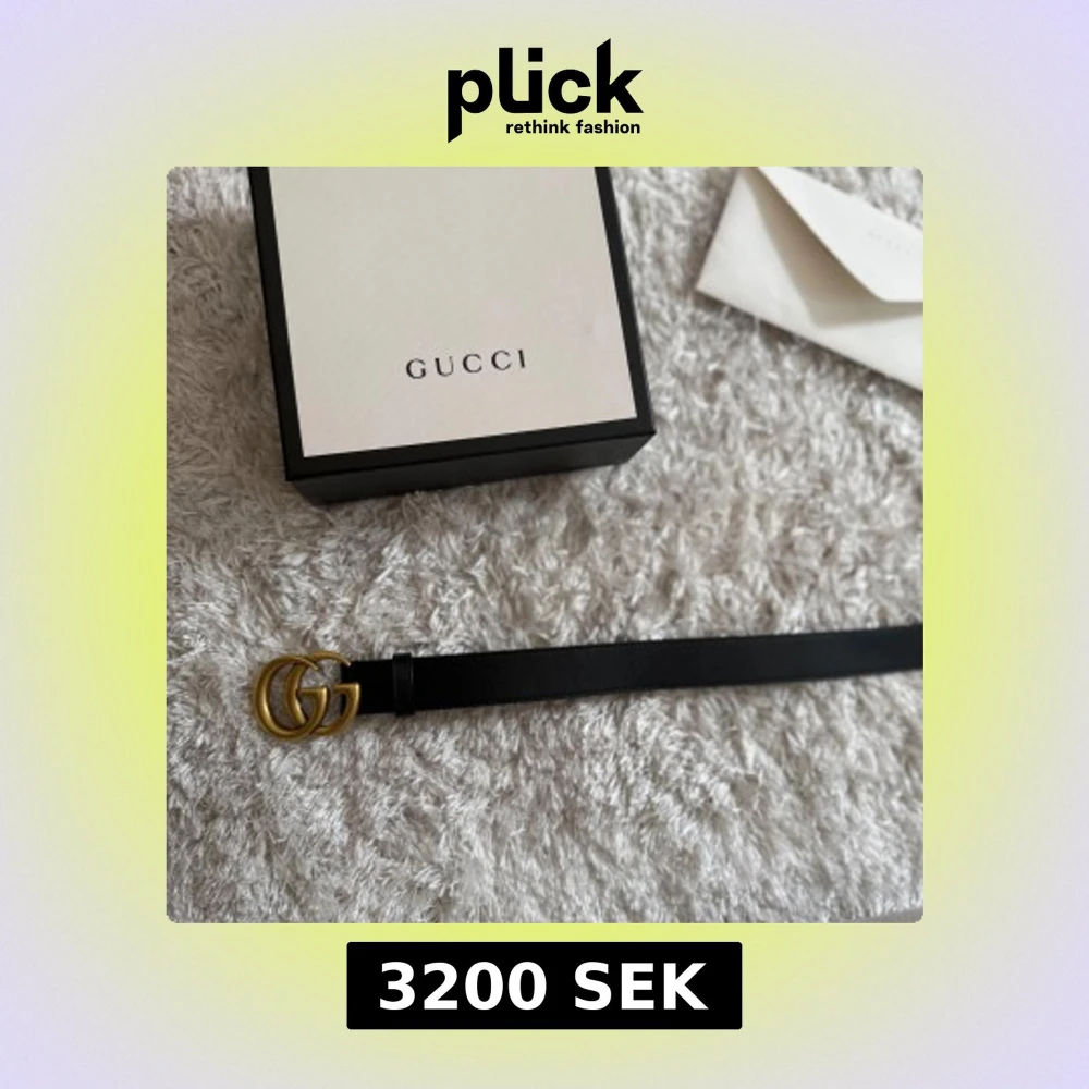Säljer mitt exklusiva Gucci-bälte i svart läder med den ikoniska guldiga GG-loggan. Storlek: [80.32] Bältet är i nyskick, endast provat några gånger och kommer i originalförpackning med dust bag och kvitto. Perfekt för dig som vill höja din stil med en tidlös och elegant accessoar från ett av världens mest kända modehus. Nypris: ca [ny pris 4200kr] Mitt pris: [3200kr]