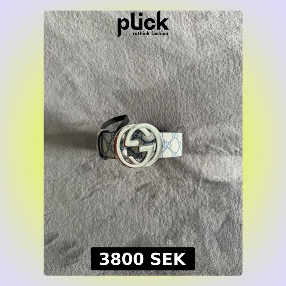 Gucci GG Supreme bälte med klassiskt monogrammönster i beige och blått. Bältet har en stor, rund silverspänne med GG-logga och insida i ljust brunt skinn. Perfekt accessoar för att lyfta vilken outfit som helst.